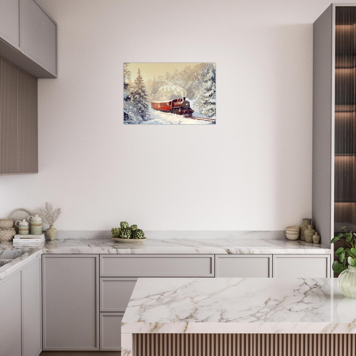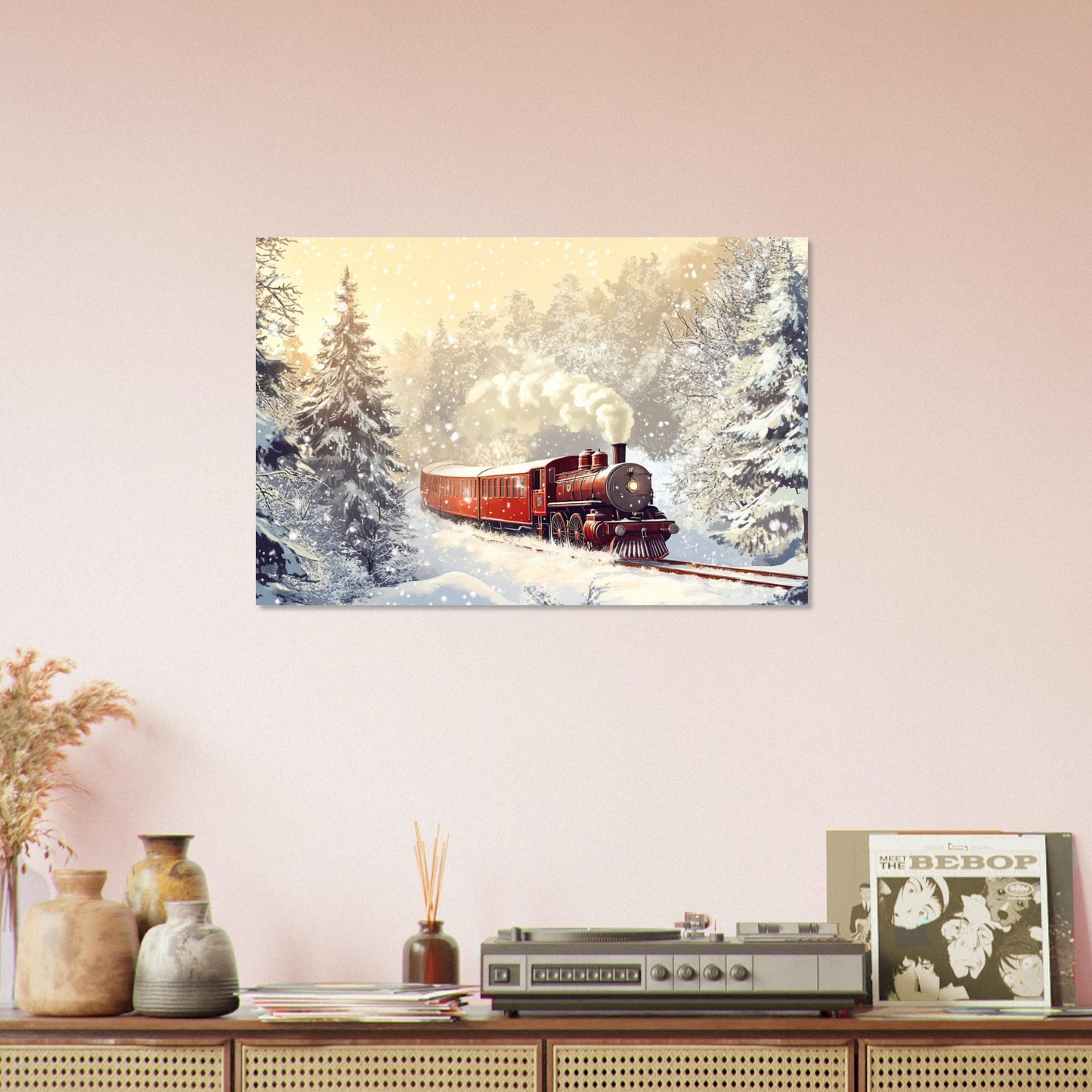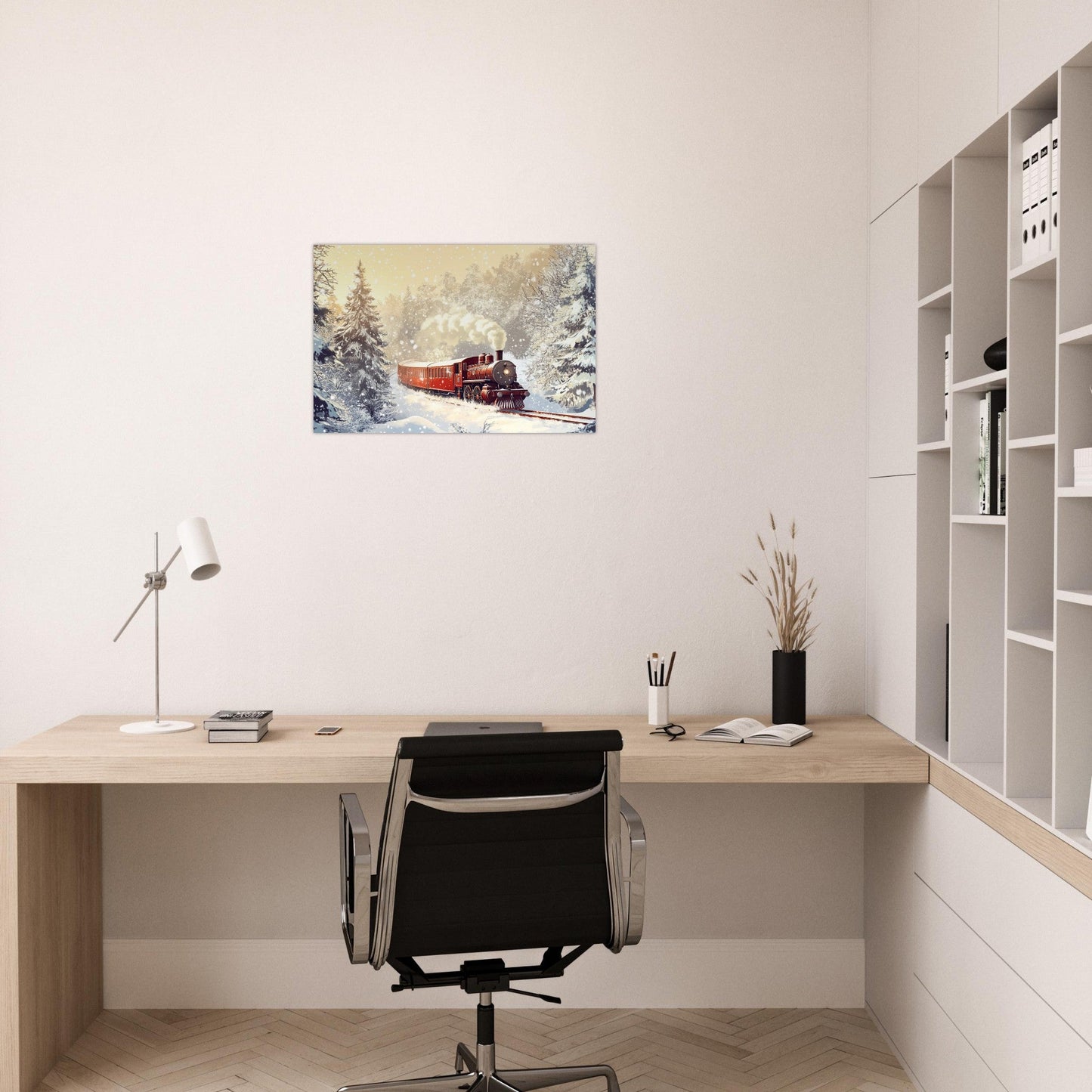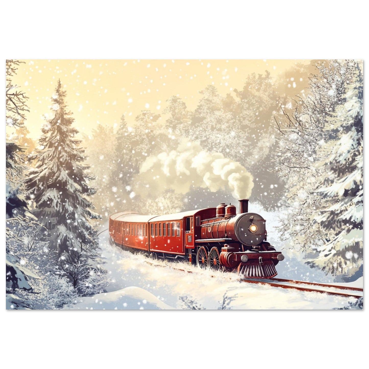 Roter Dampfzug im Schnee – KI-Bild
