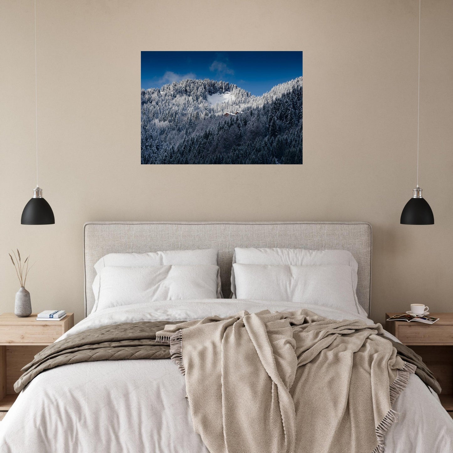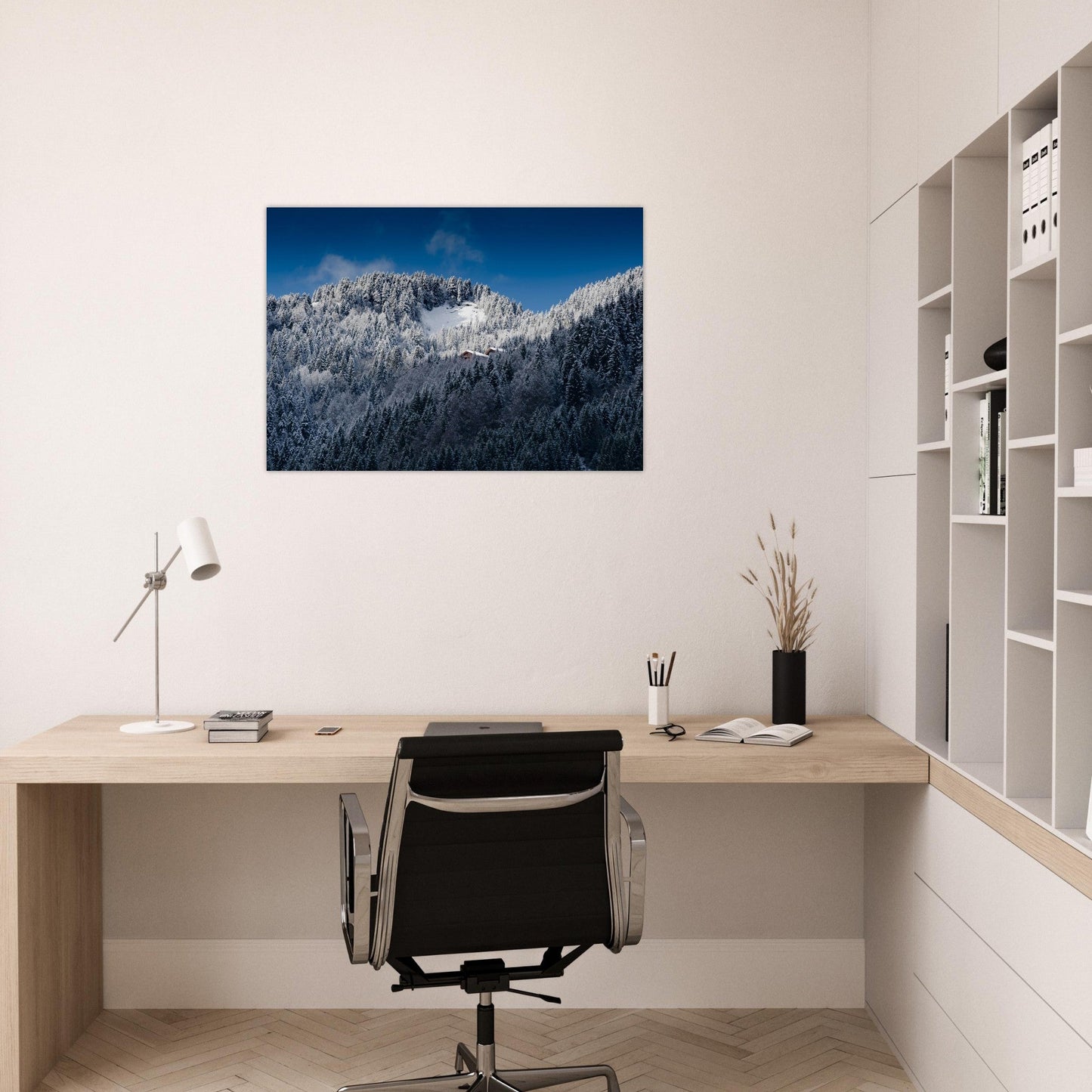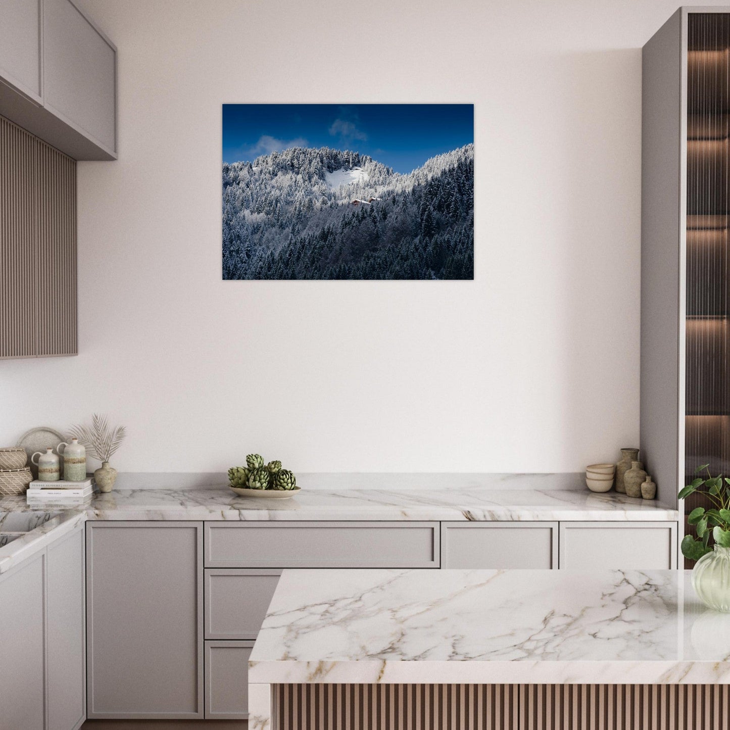 Aluminium-Dibond bietet perfekte Planlage, eine matte Oberfläche ohne Blendeffekte und lange Haltbarkeit ohne Verglasung – ideal zur Hervorhebung von Bergdetails. Das Gemälde ist fertig zum Aufhängen.