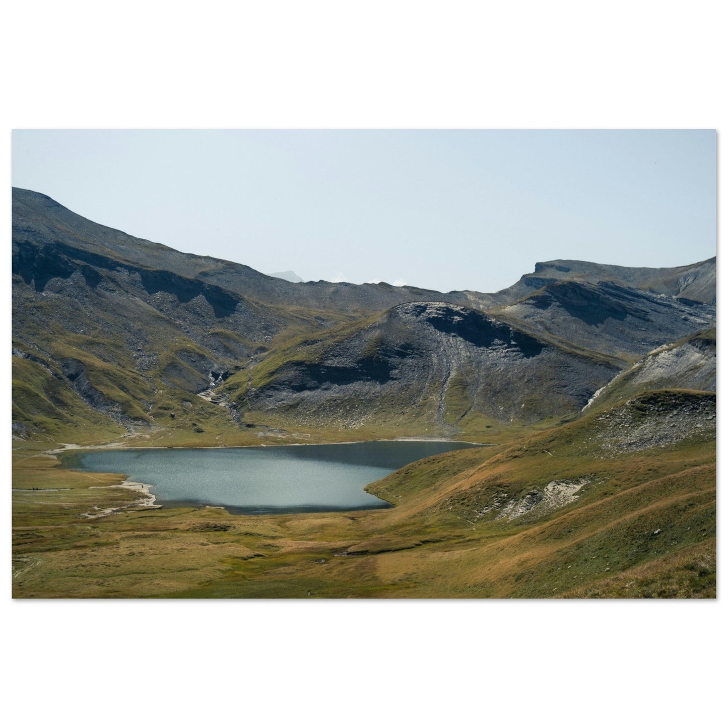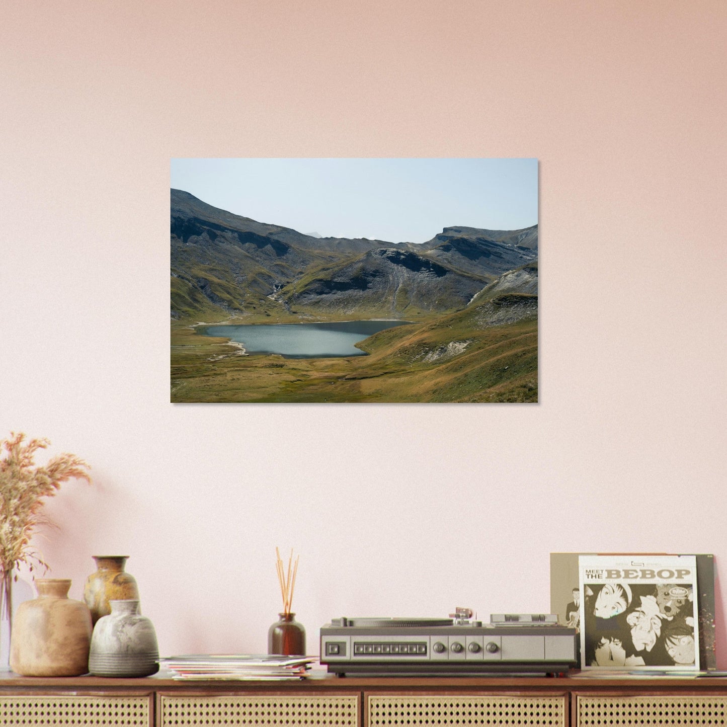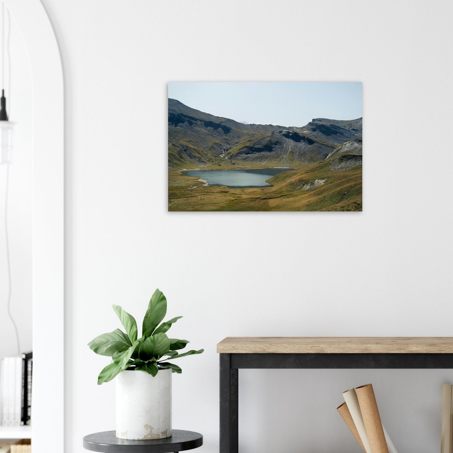 Den Rahmen lesen: See im Vordergrund, Fiz-Kämme am Horizont, Kurven von Almwiesen und Spuren mineralischer Erosion. Eine beruhigende Szene, ideal für eine natürliches und zeitgenössisches Dekor.