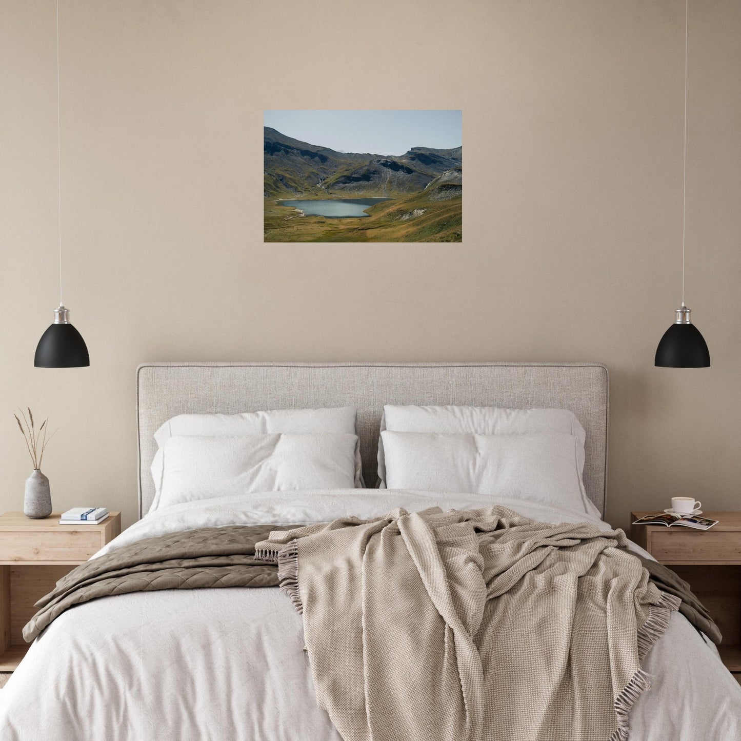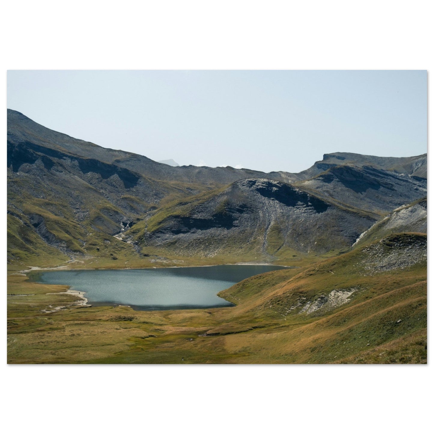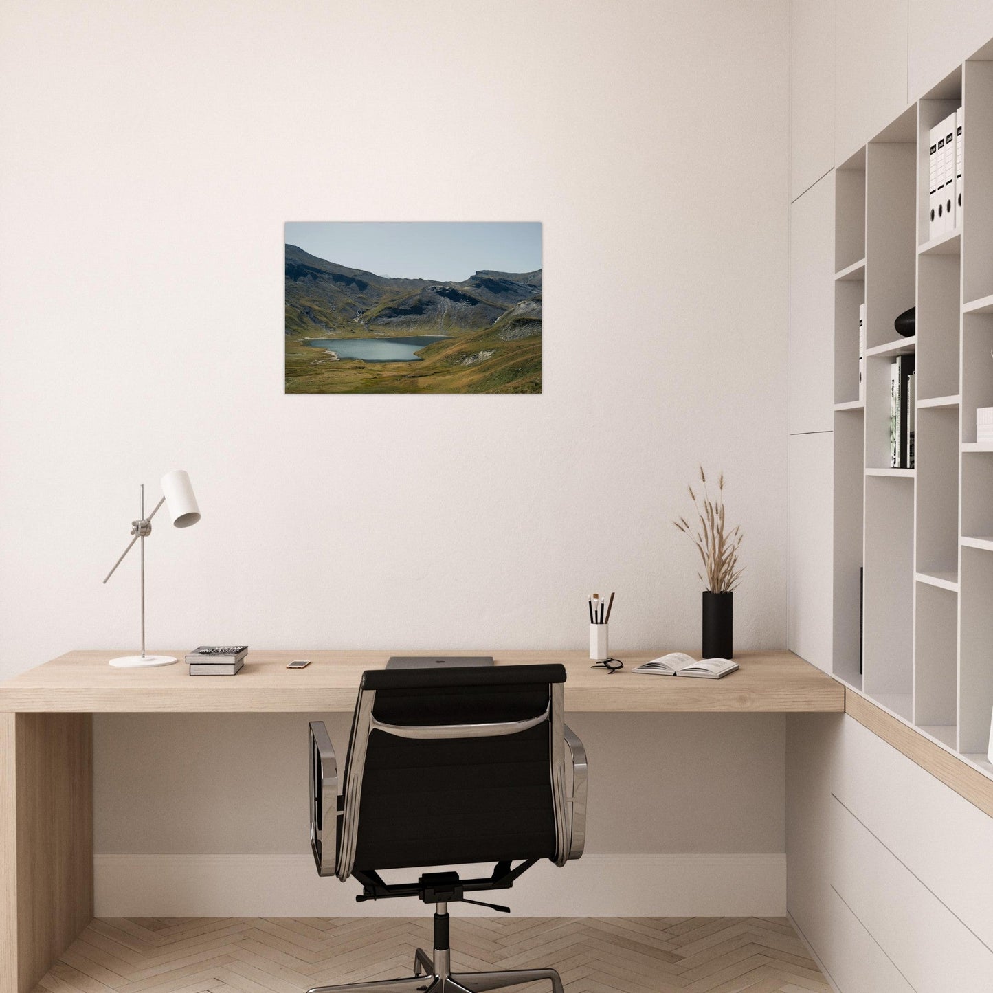 Den Rahmen lesen: See im Vordergrund, Fiz-Kämme am Horizont, Kurven von Almwiesen und Spuren mineralischer Erosion. Eine beruhigende Szene, ideal für eine natürliches und zeitgenössisches Dekor.