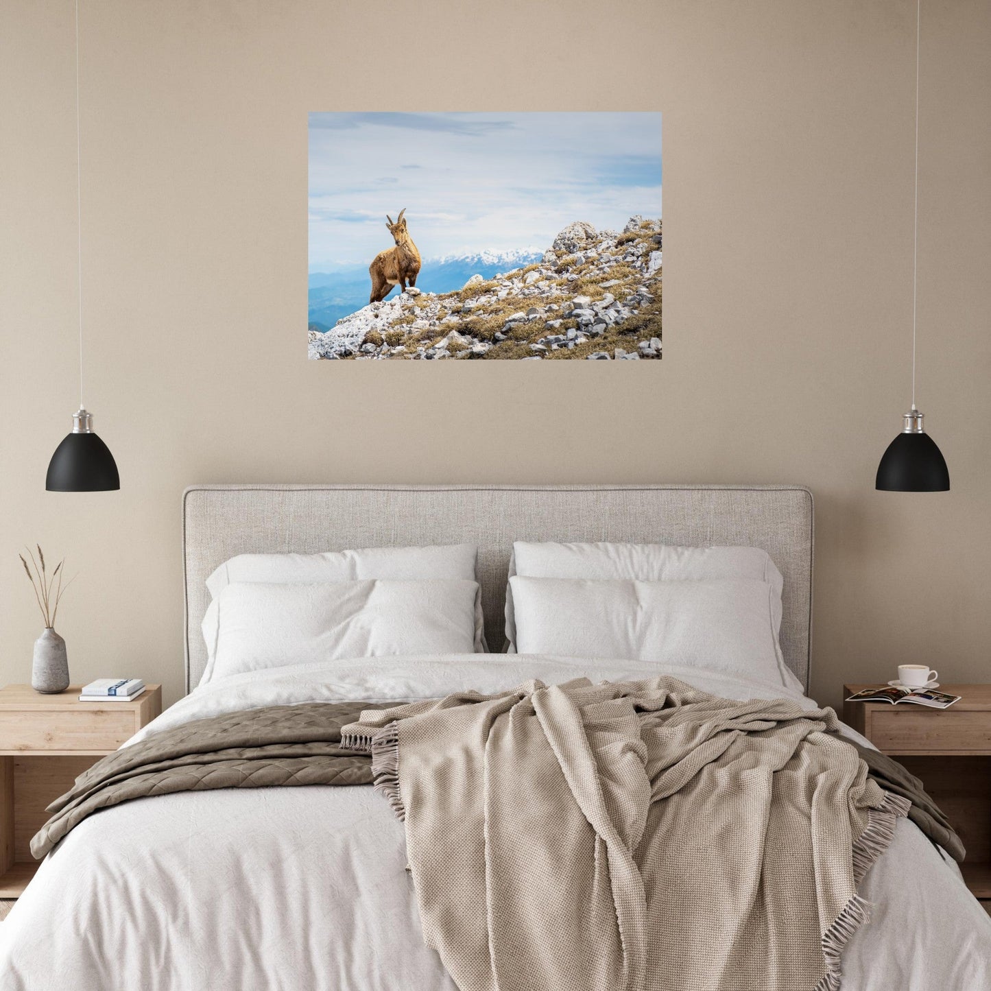 - Natürliche Palette : Brauntöne des Fells, Kalksteingrau, Blau – alpine Atmosphäre.