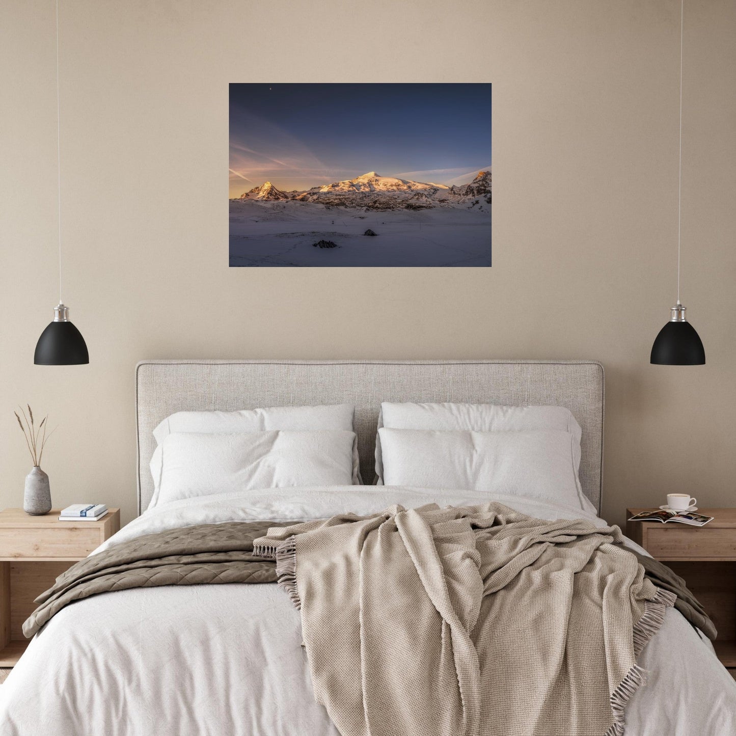 Schwarz-weiße Gestaltung einer Wohnung in Zermatt mit dem Matterhorn im Hintergrund. Bildauswahl, Simulation, Produktion und Lieferung matter Dibond-Aluminiumdrucke für ein elegantes und zeitloses Finish.