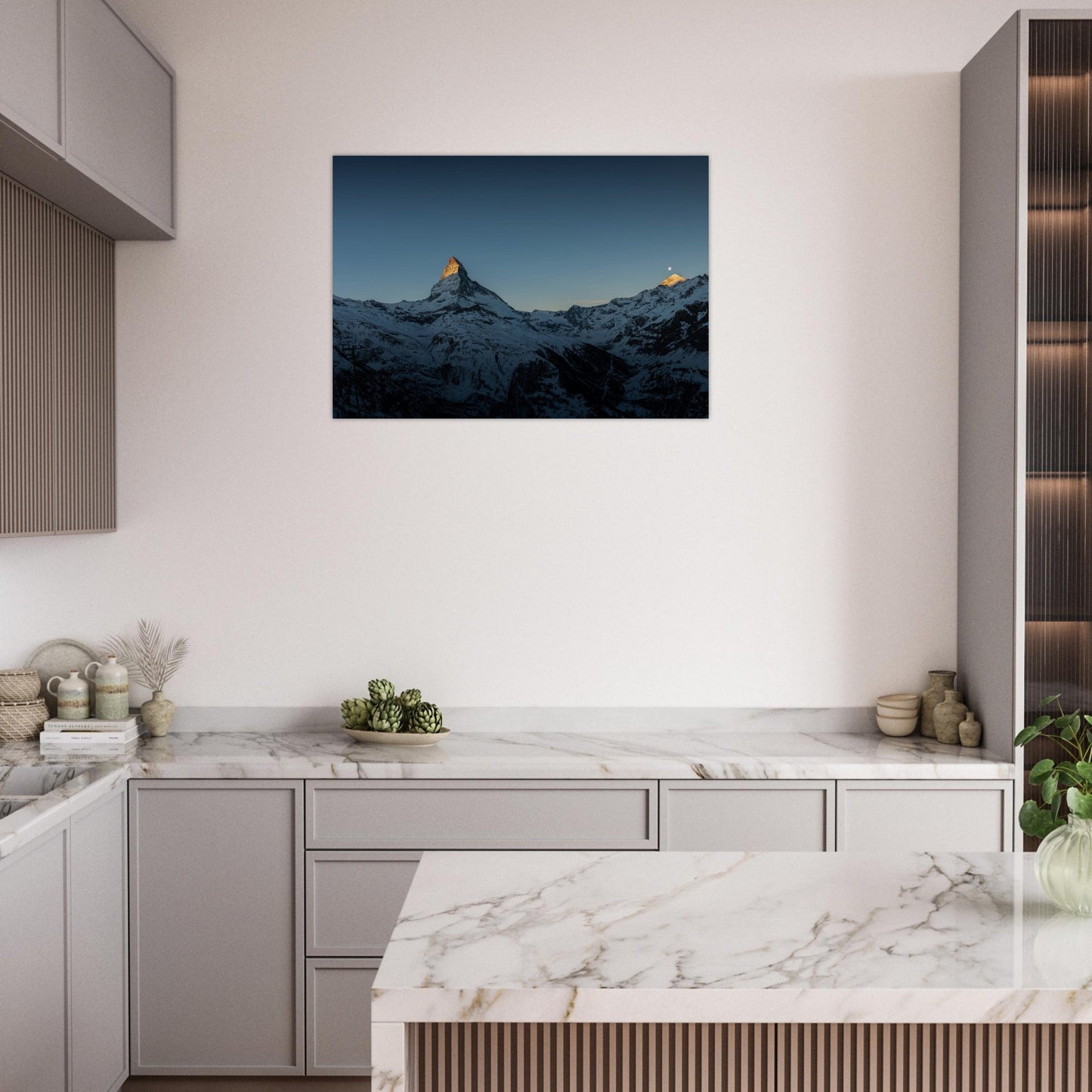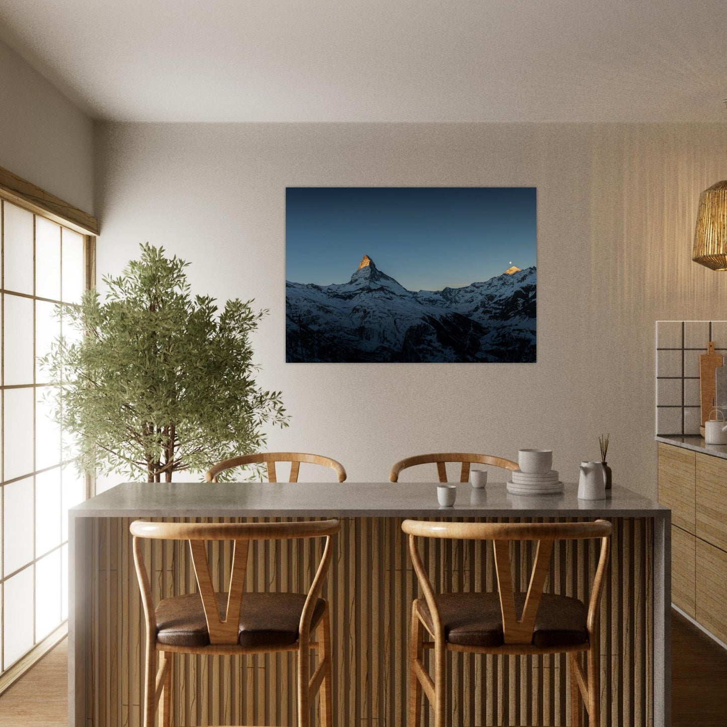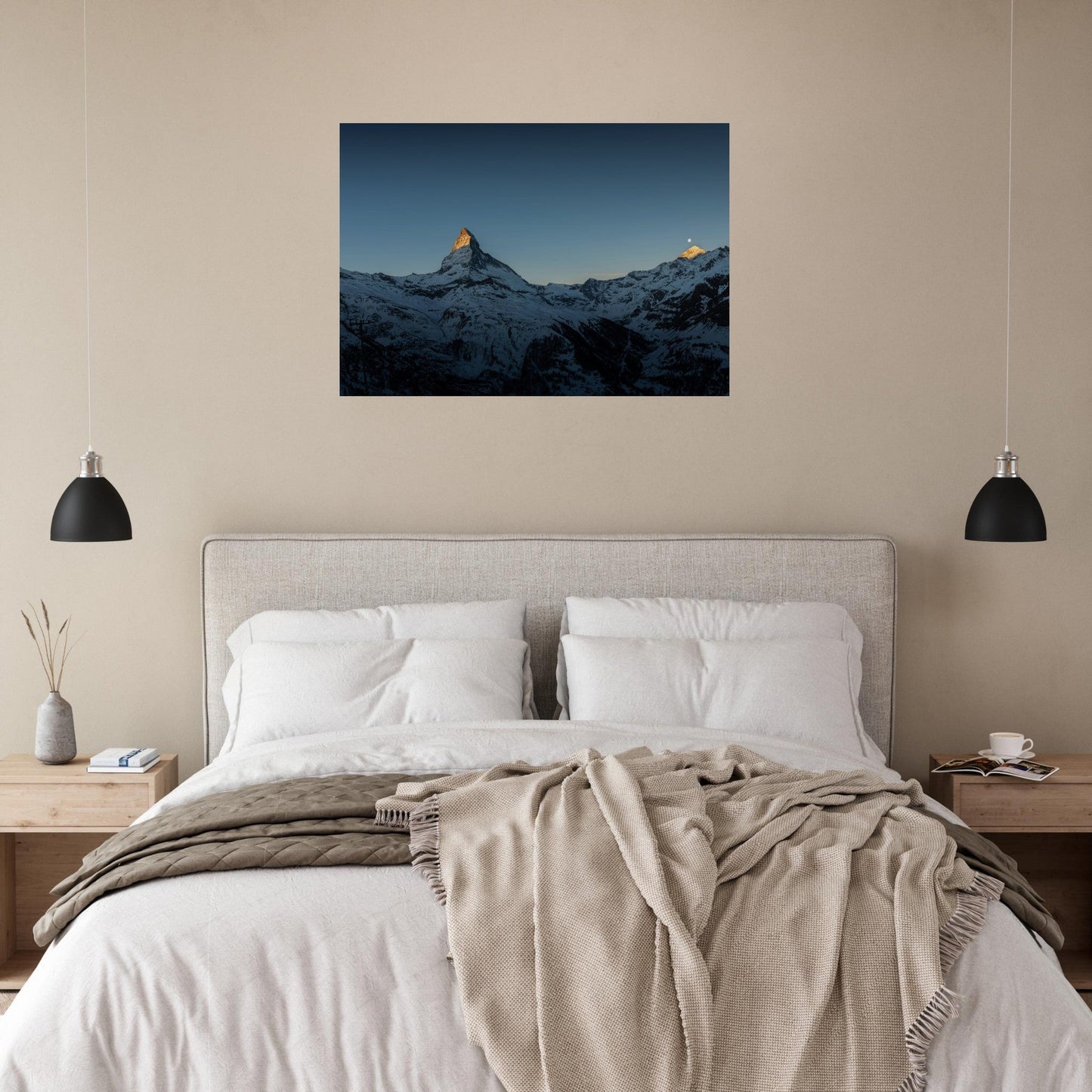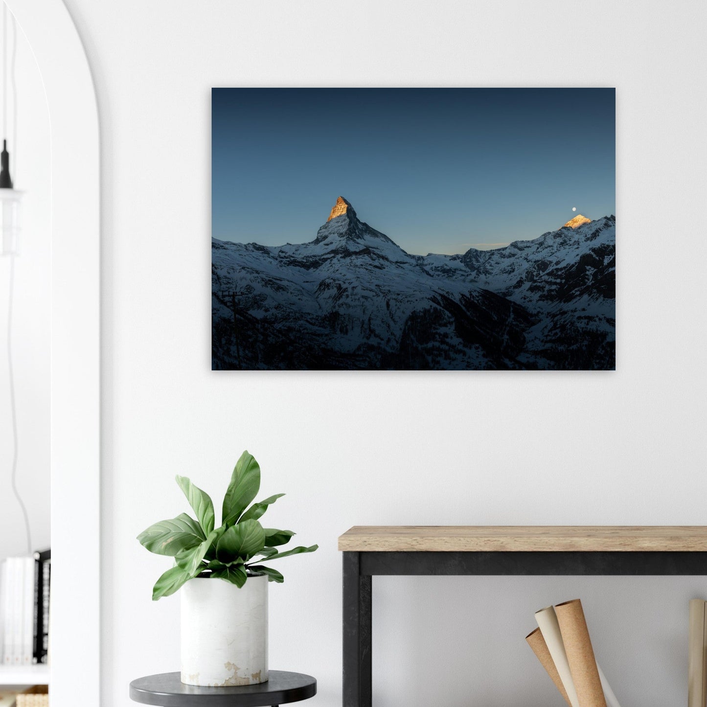 Schwarz-weiße Gestaltung einer Wohnung in Zermatt mit dem Matterhorn im Hintergrund. Bildauswahl, Simulation, Produktion und Lieferung matter Dibond-Aluminiumdrucke für ein elegantes und zeitloses Finish.