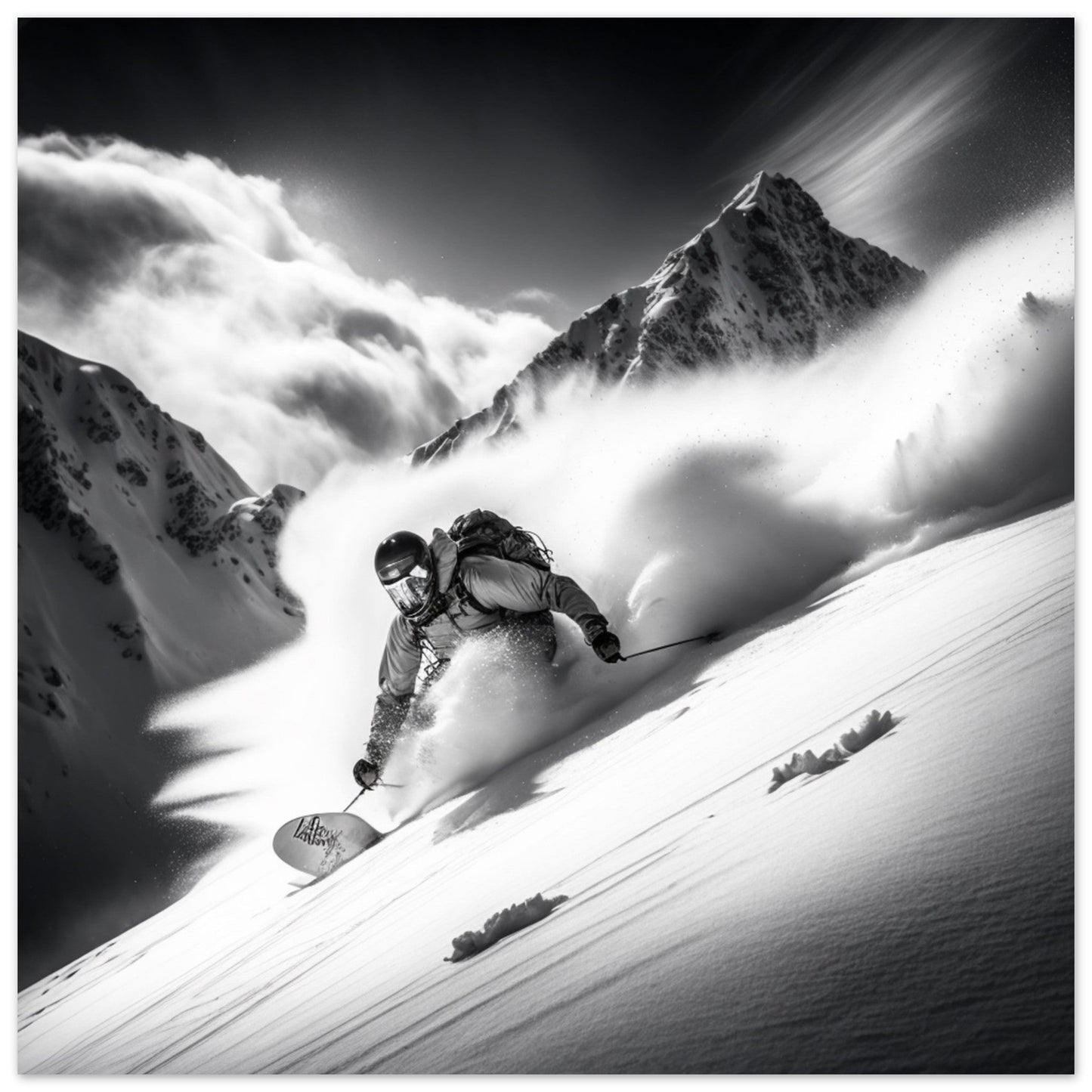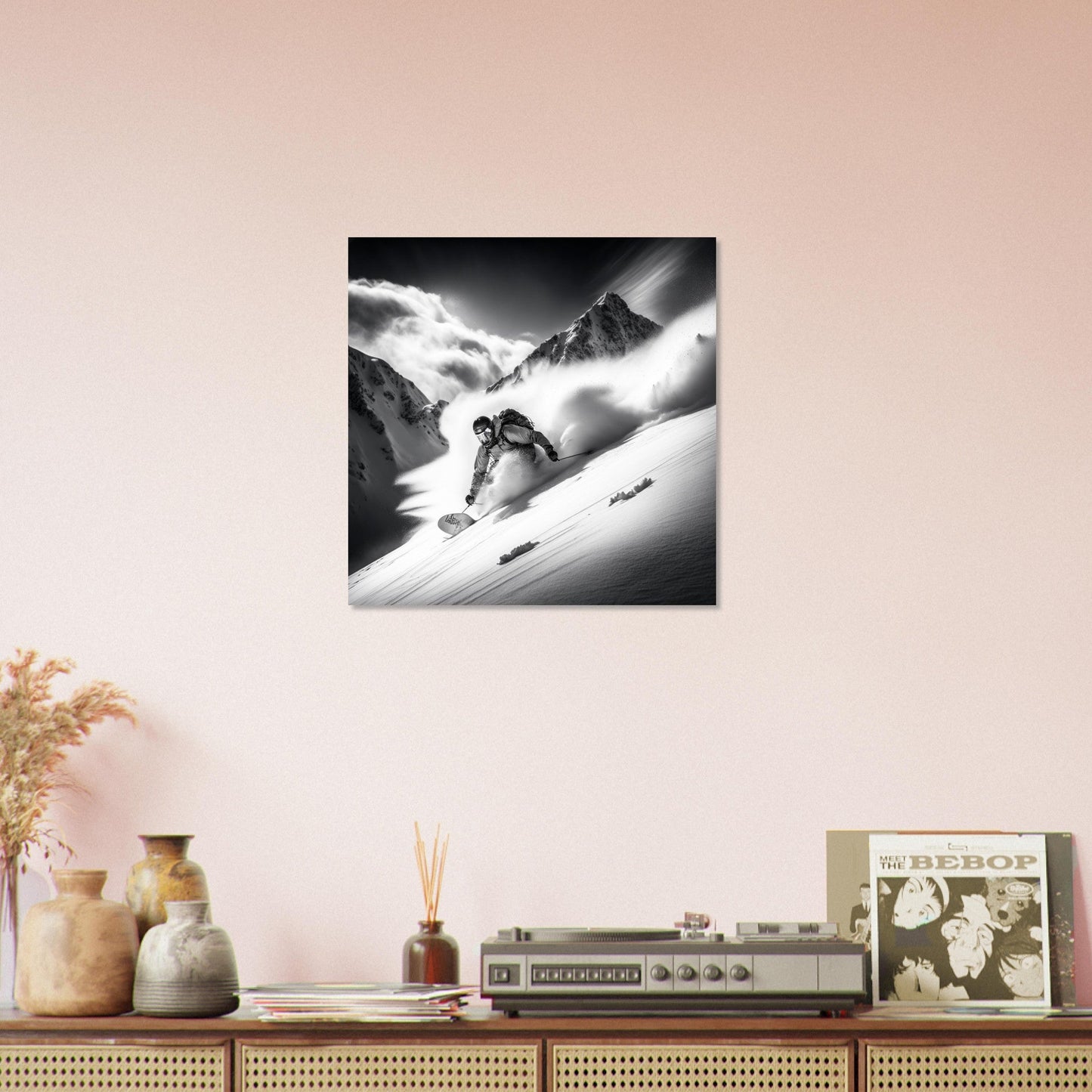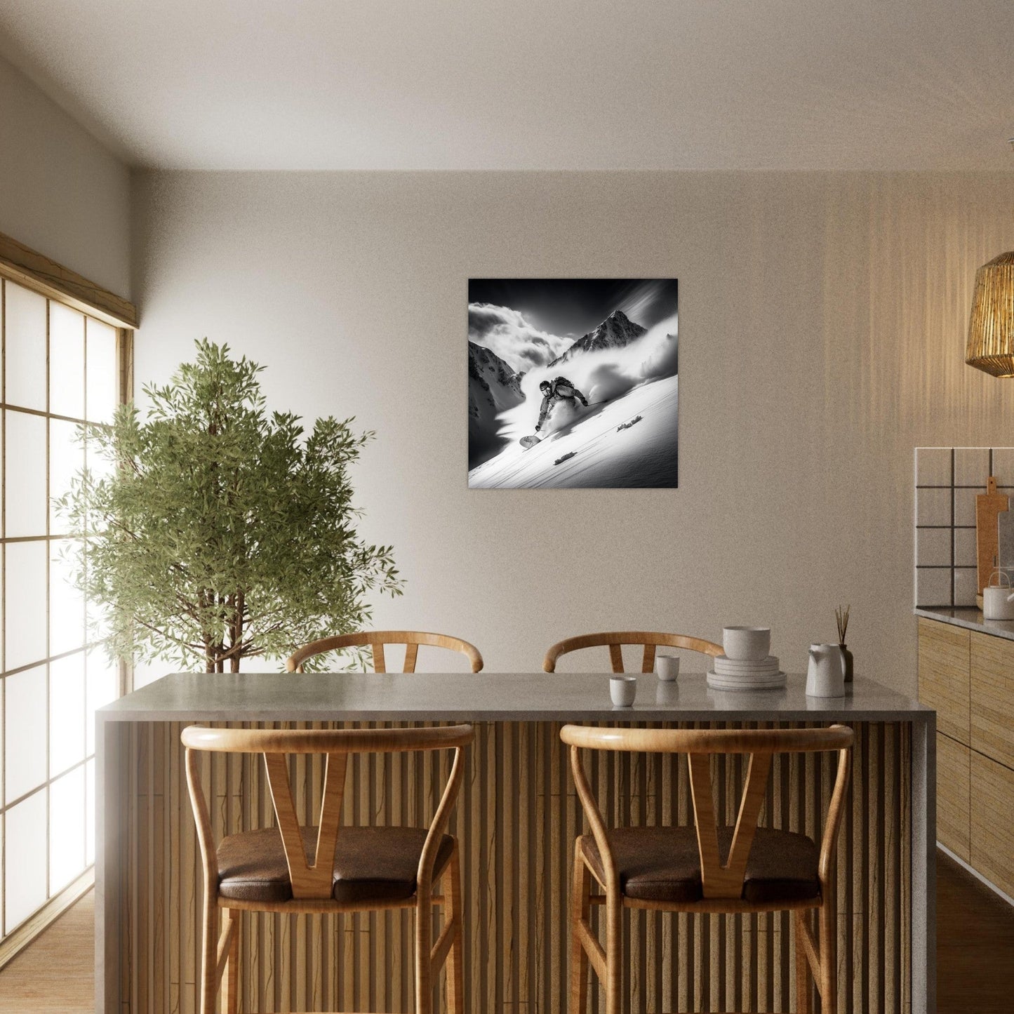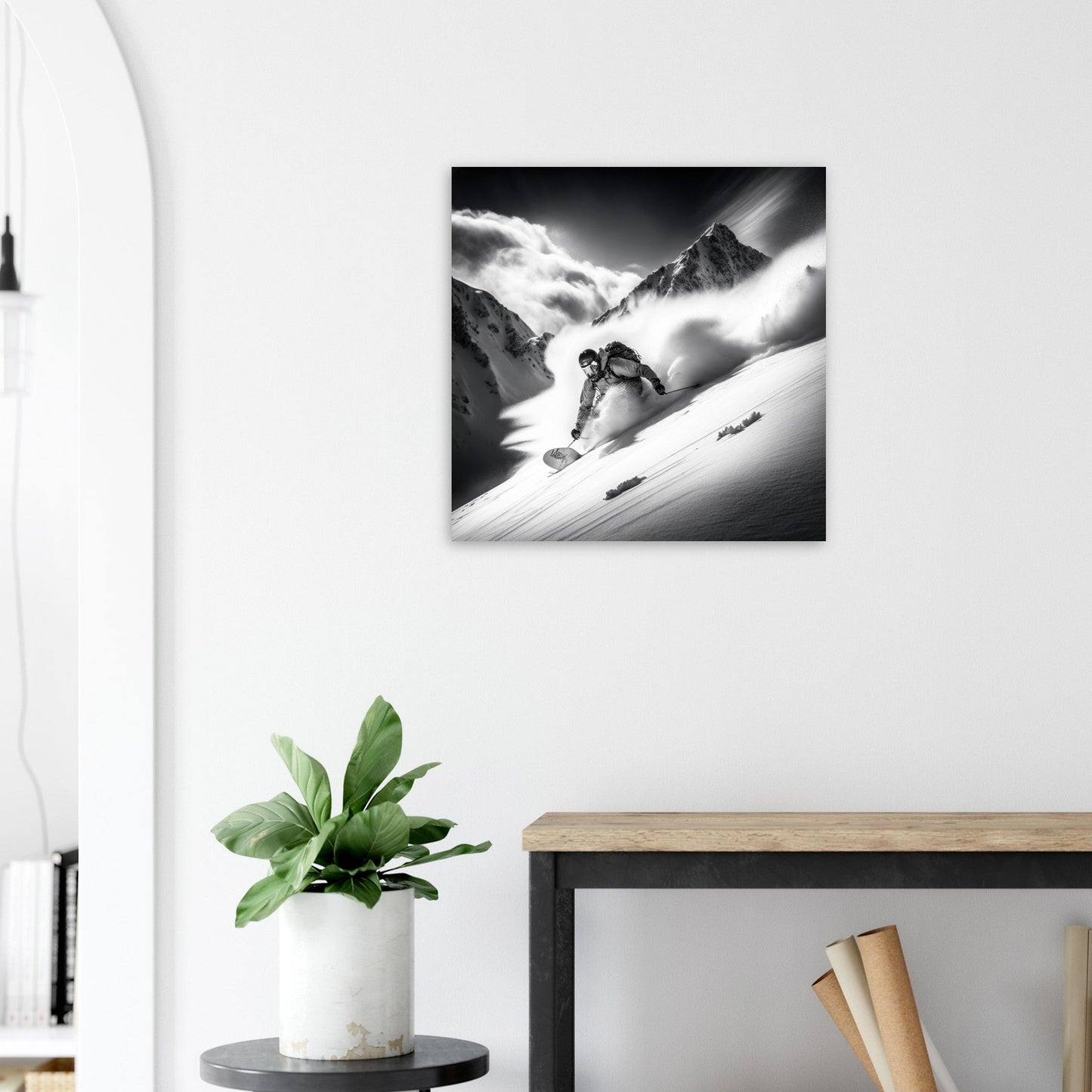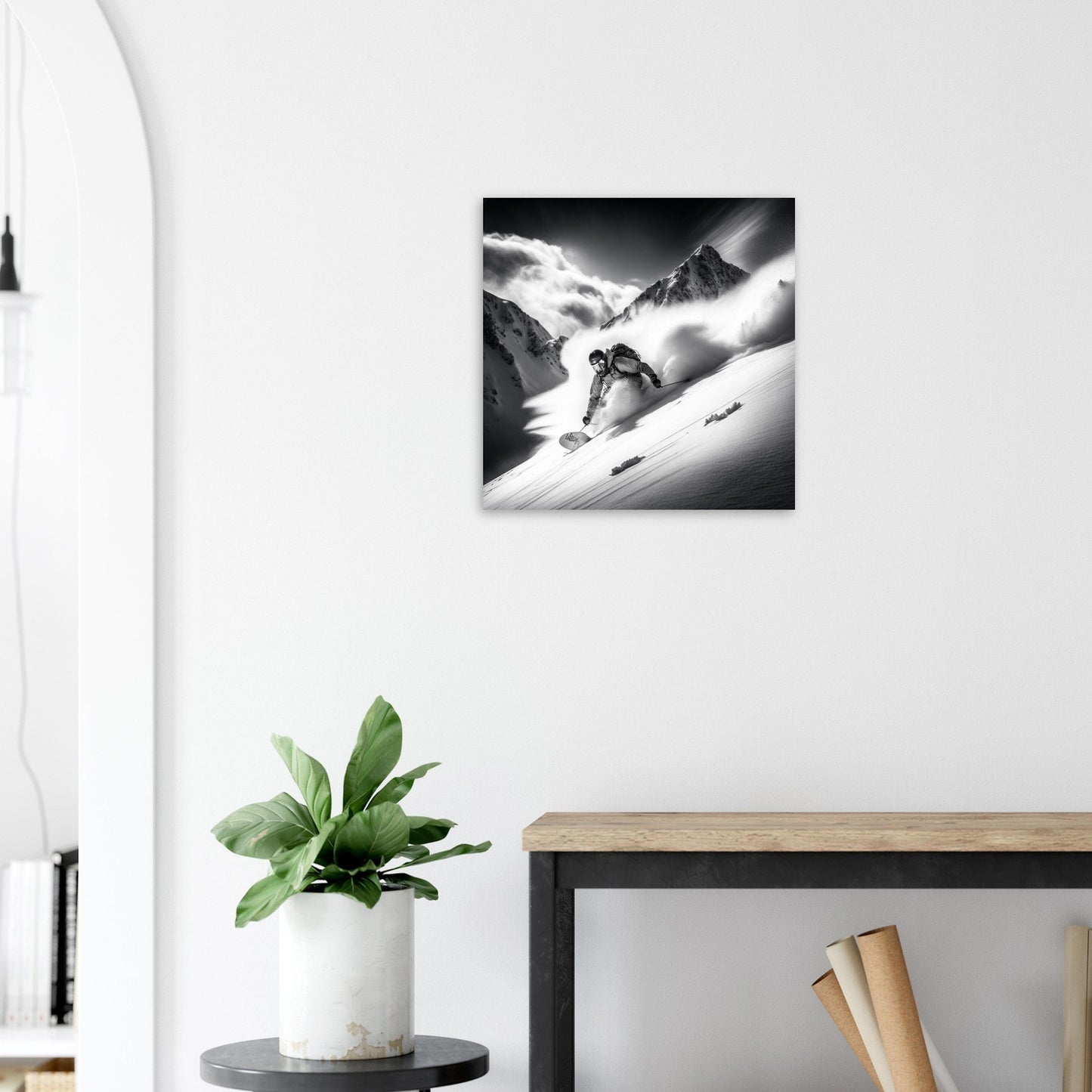 Tauchen Sie ein in das Adrenalin des Wintersports mit diesem Aluminiumgemälde, das einen Skifahrer zeigt, der in unberührtem Pulverschnee bergab fährt. Dieses in Schwarzweiß aufgenommene Foto strahlt eine einzigartige visuelle Kraft aus und verstärkt die Kontraste der Berge und die Textur des Schnees. Dieses Gemälde ist ideal für Fans von Sport und alpinen Landschaften und verleiht Ihrem Interieur eine moderne und dynamische Note.