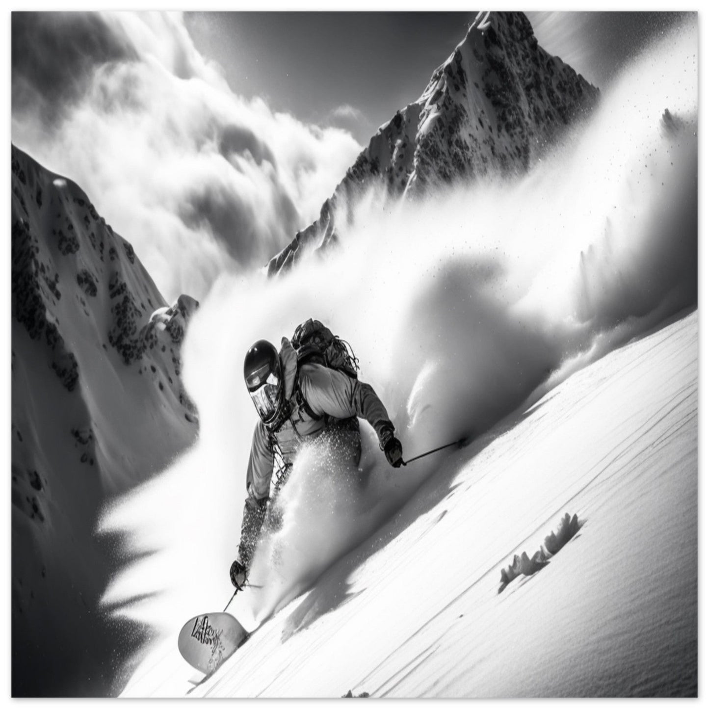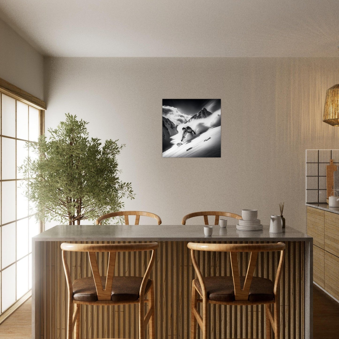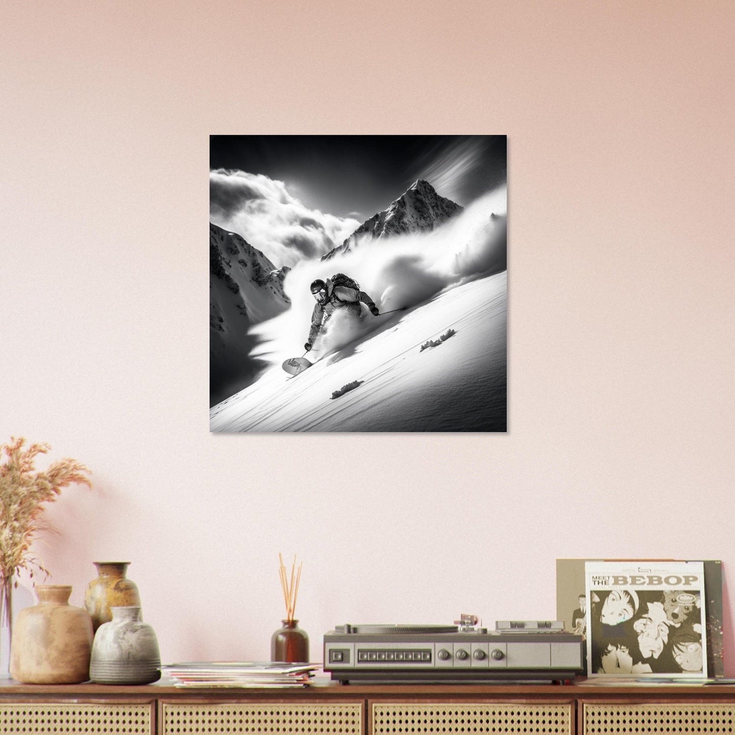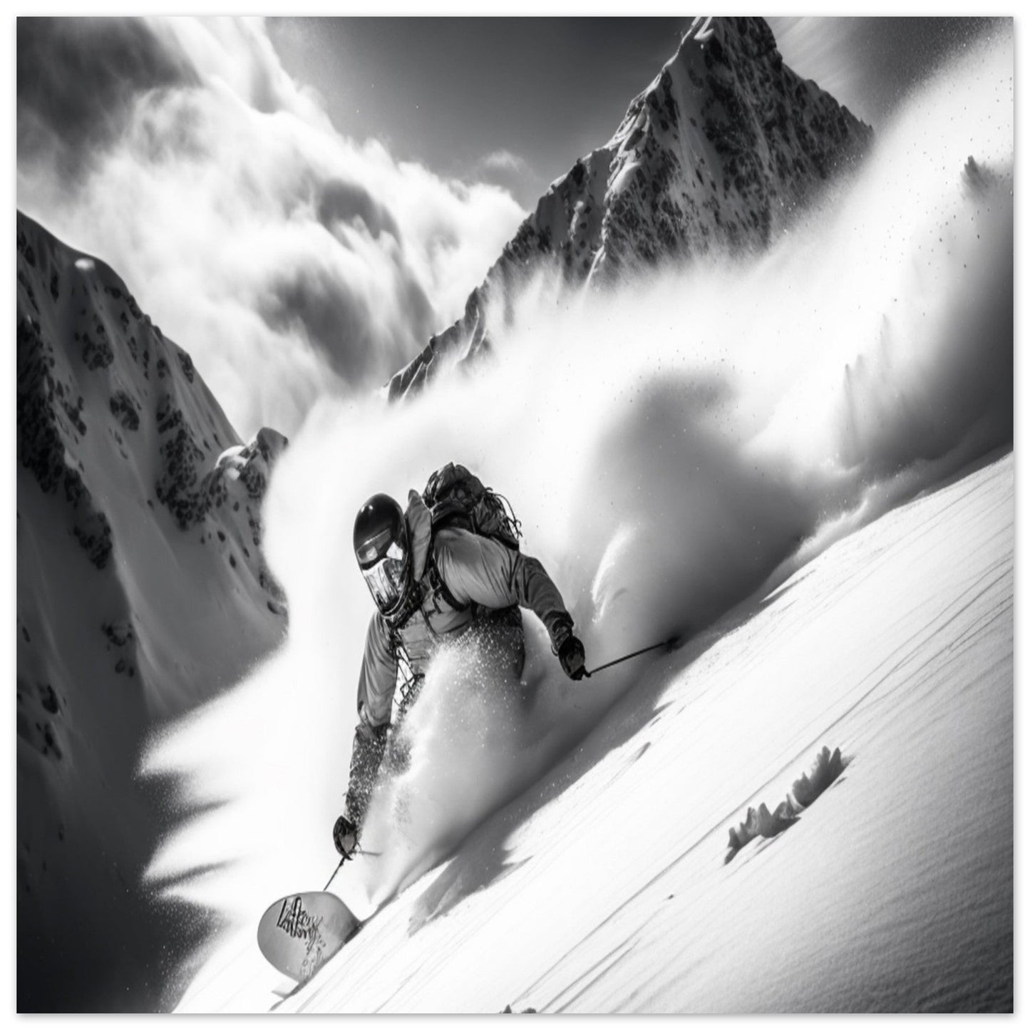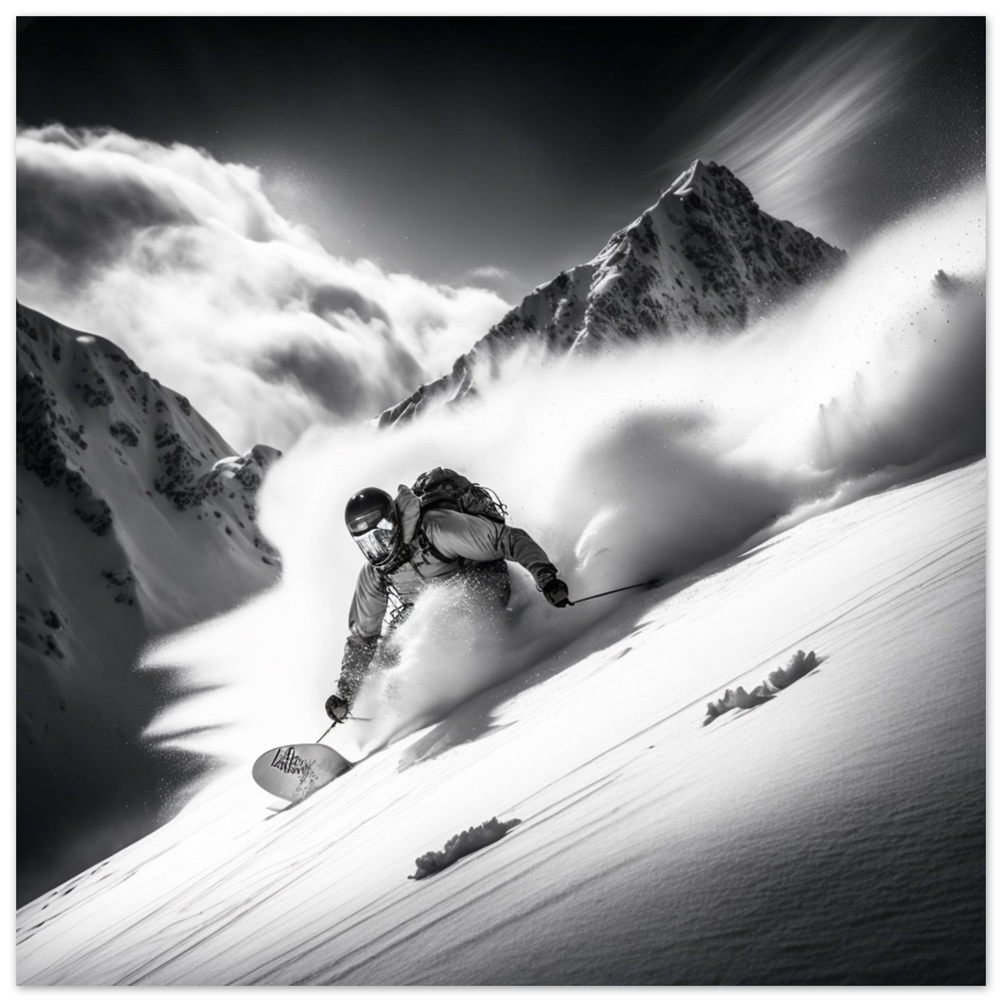 Tauchen Sie ein in das Adrenalin des Wintersports mit diesem Aluminiumgemälde, das einen Skifahrer zeigt, der in unberührtem Pulverschnee bergab fährt. Dieses in Schwarzweiß aufgenommene Foto strahlt eine einzigartige visuelle Kraft aus und verstärkt die Kontraste der Berge und die Textur des Schnees. Dieses Gemälde ist ideal für Fans von Sport und alpinen Landschaften und verleiht Ihrem Interieur eine moderne und dynamische Note.
