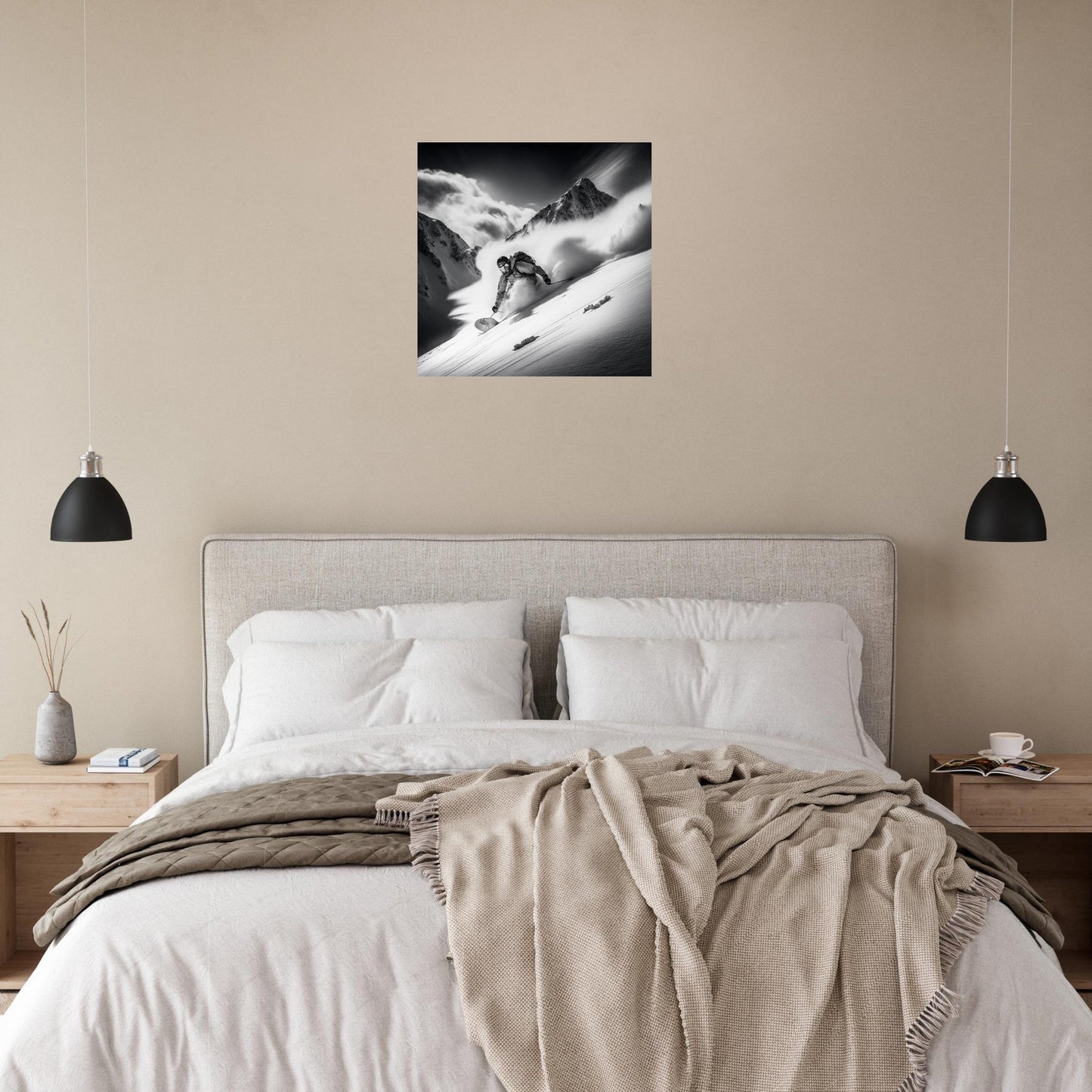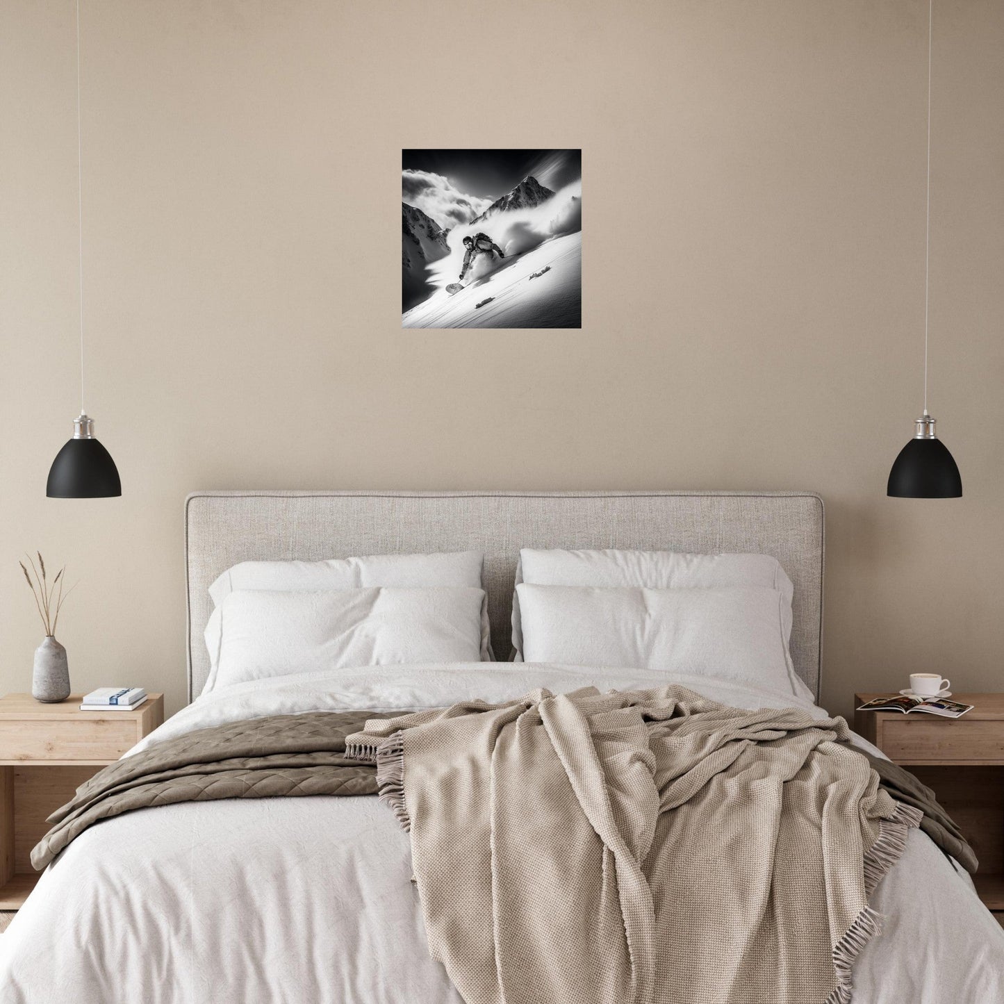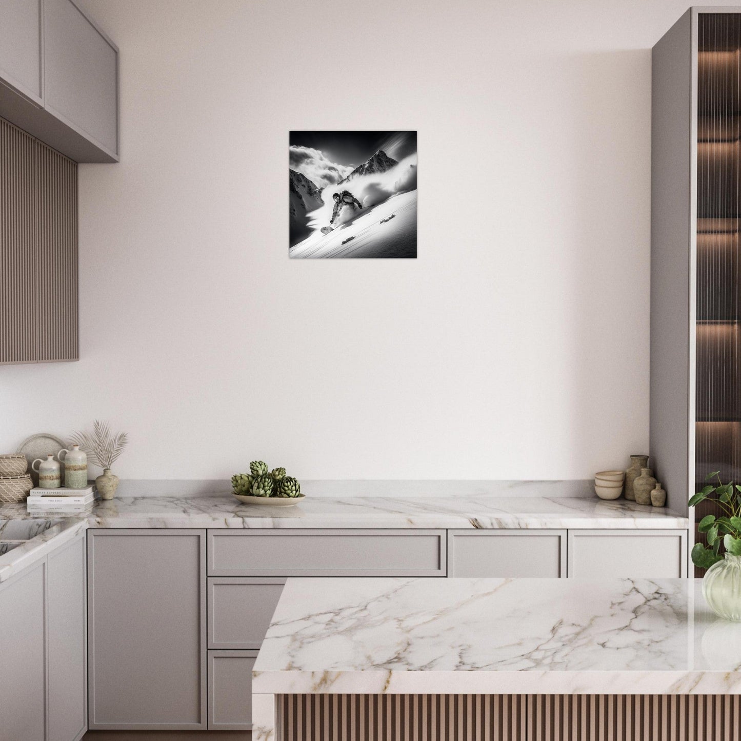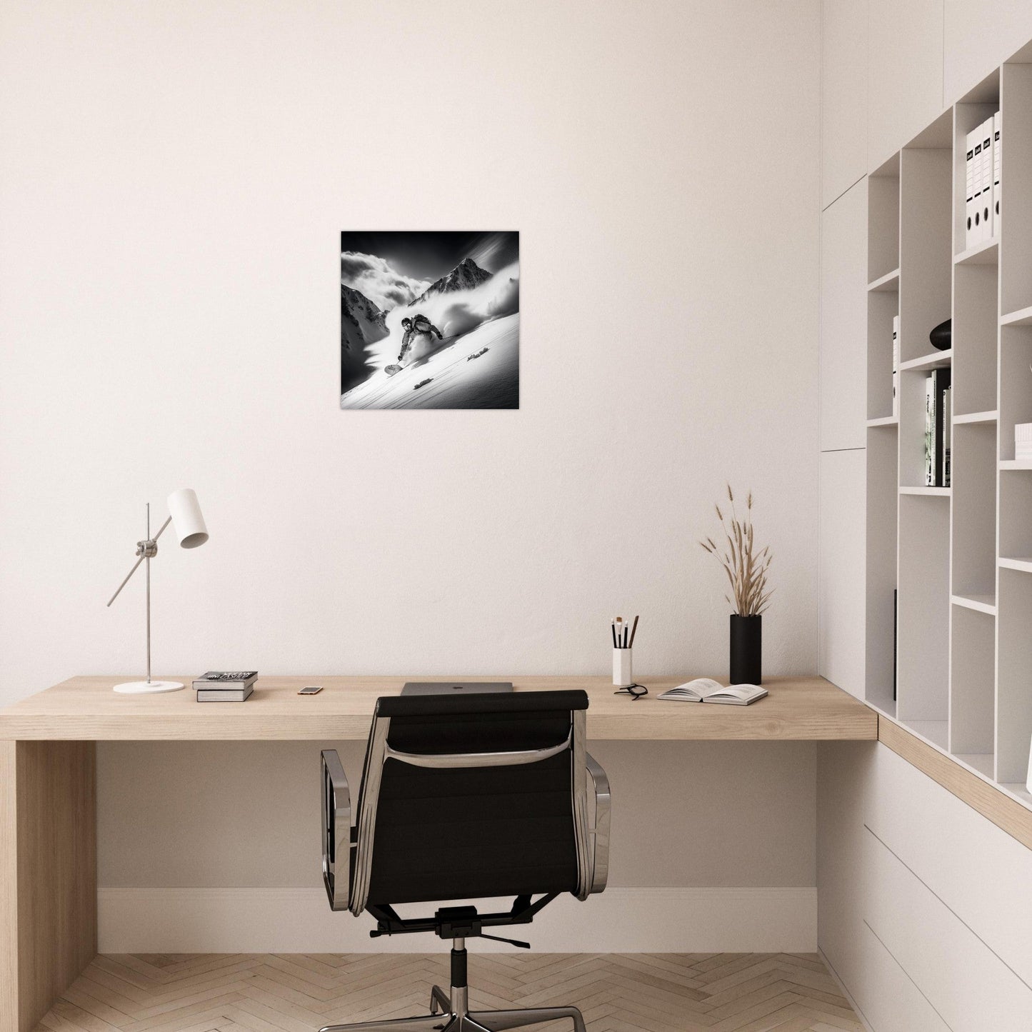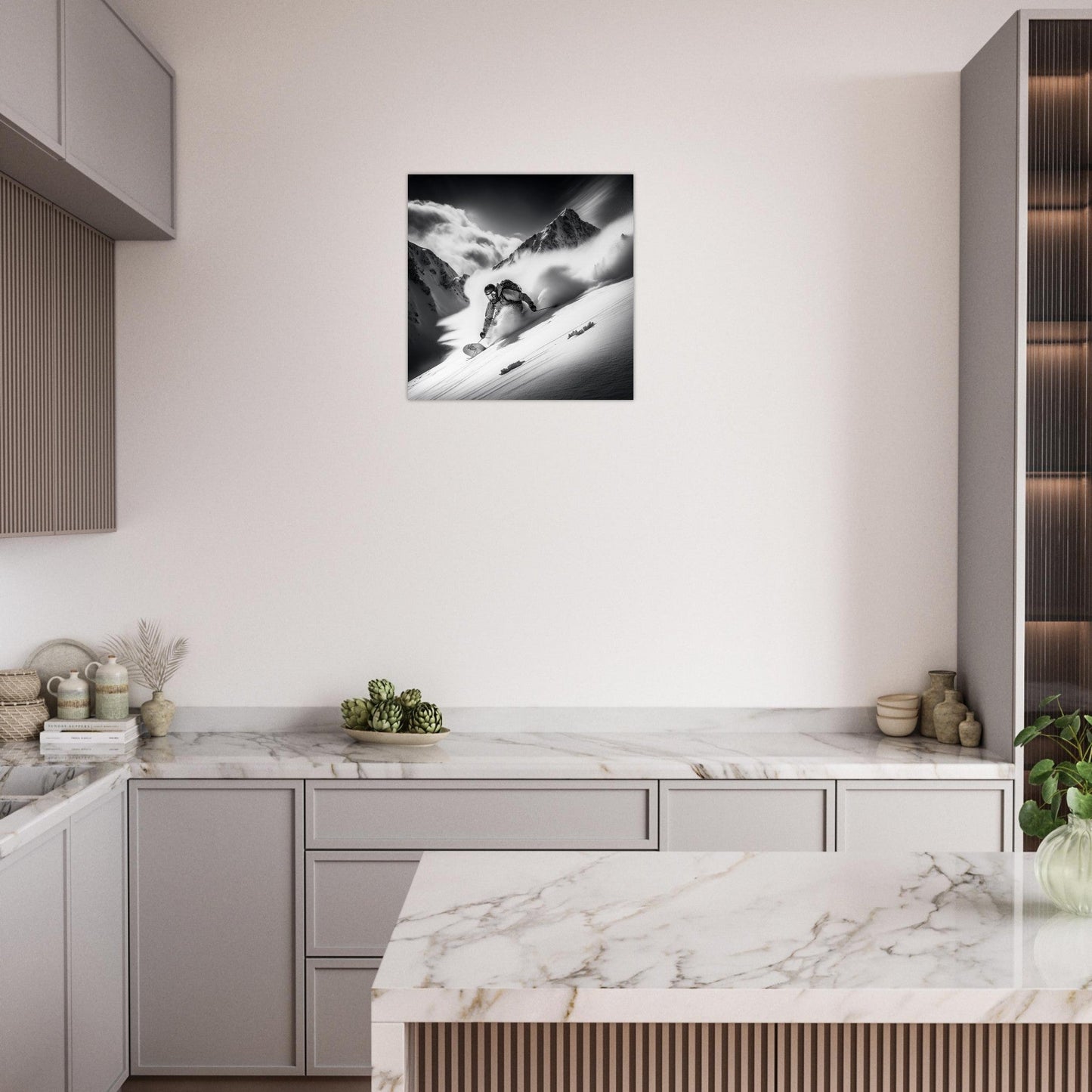 Tauchen Sie ein in das Adrenalin des Wintersports mit diesem Aluminiumgemälde, das einen Skifahrer zeigt, der in unberührtem Pulverschnee bergab fährt. Dieses in Schwarzweiß aufgenommene Foto strahlt eine einzigartige visuelle Kraft aus und verstärkt die Kontraste der Berge und die Textur des Schnees. Dieses Gemälde ist ideal für Fans von Sport und alpinen Landschaften und verleiht Ihrem Interieur eine moderne und dynamische Note.