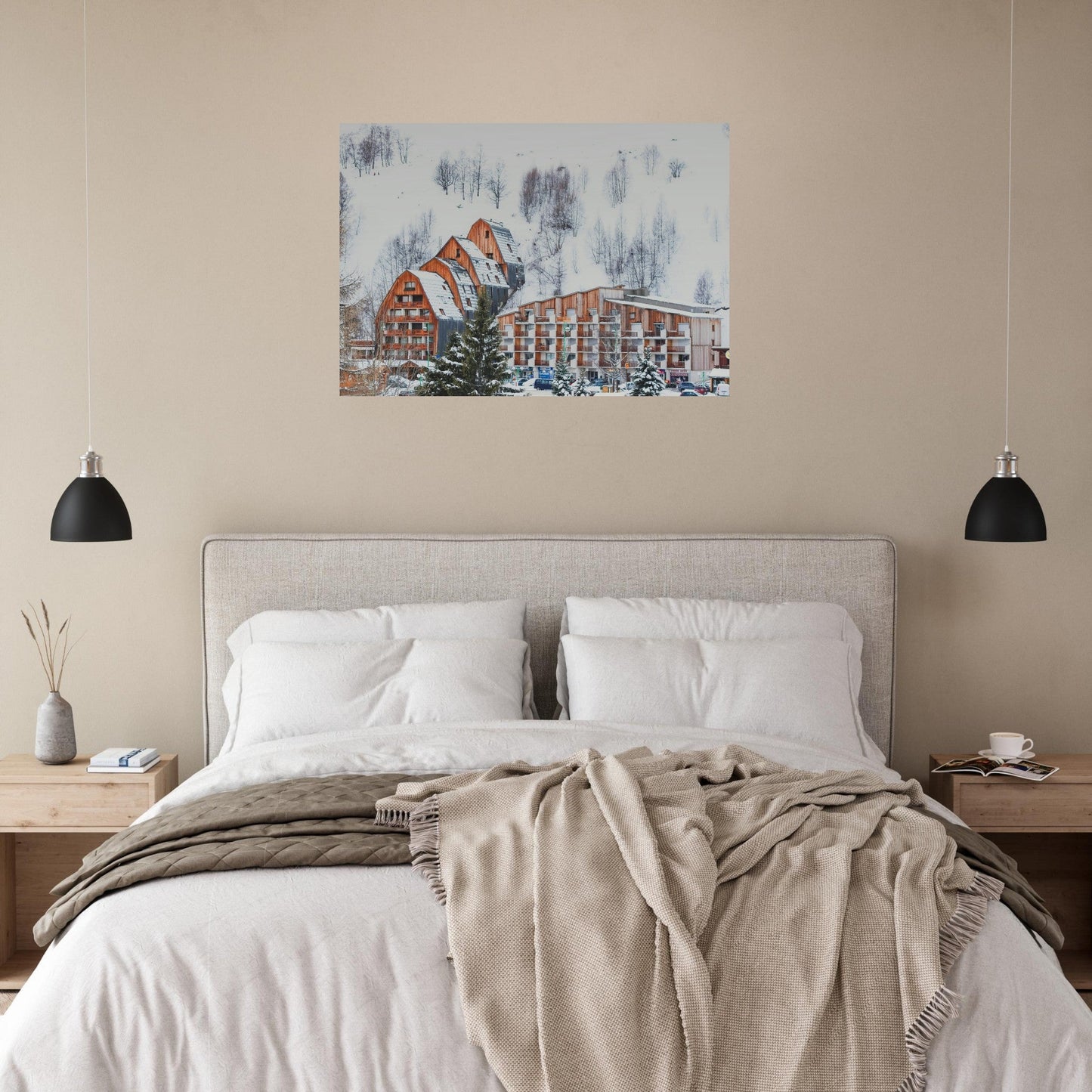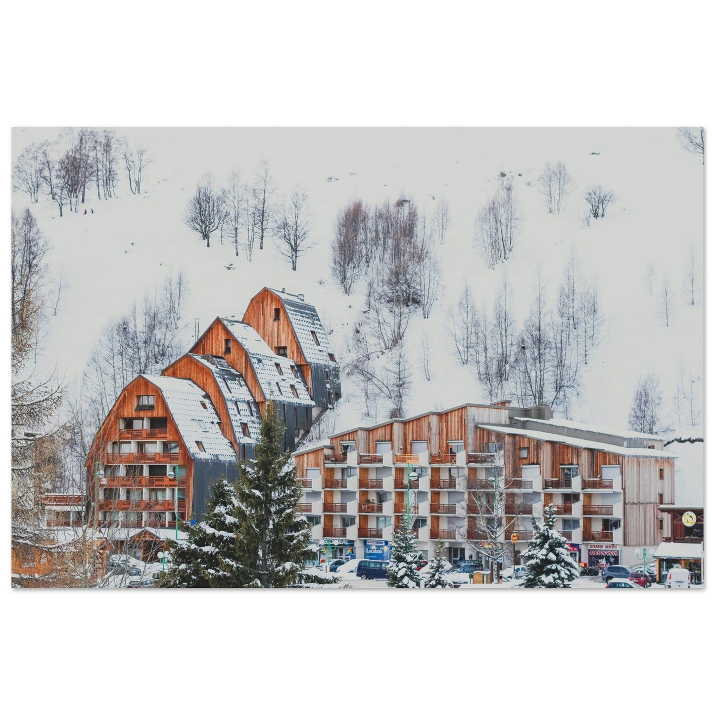 - Scenery : resort village, snow-covered roofs, snow front, marked slopes.