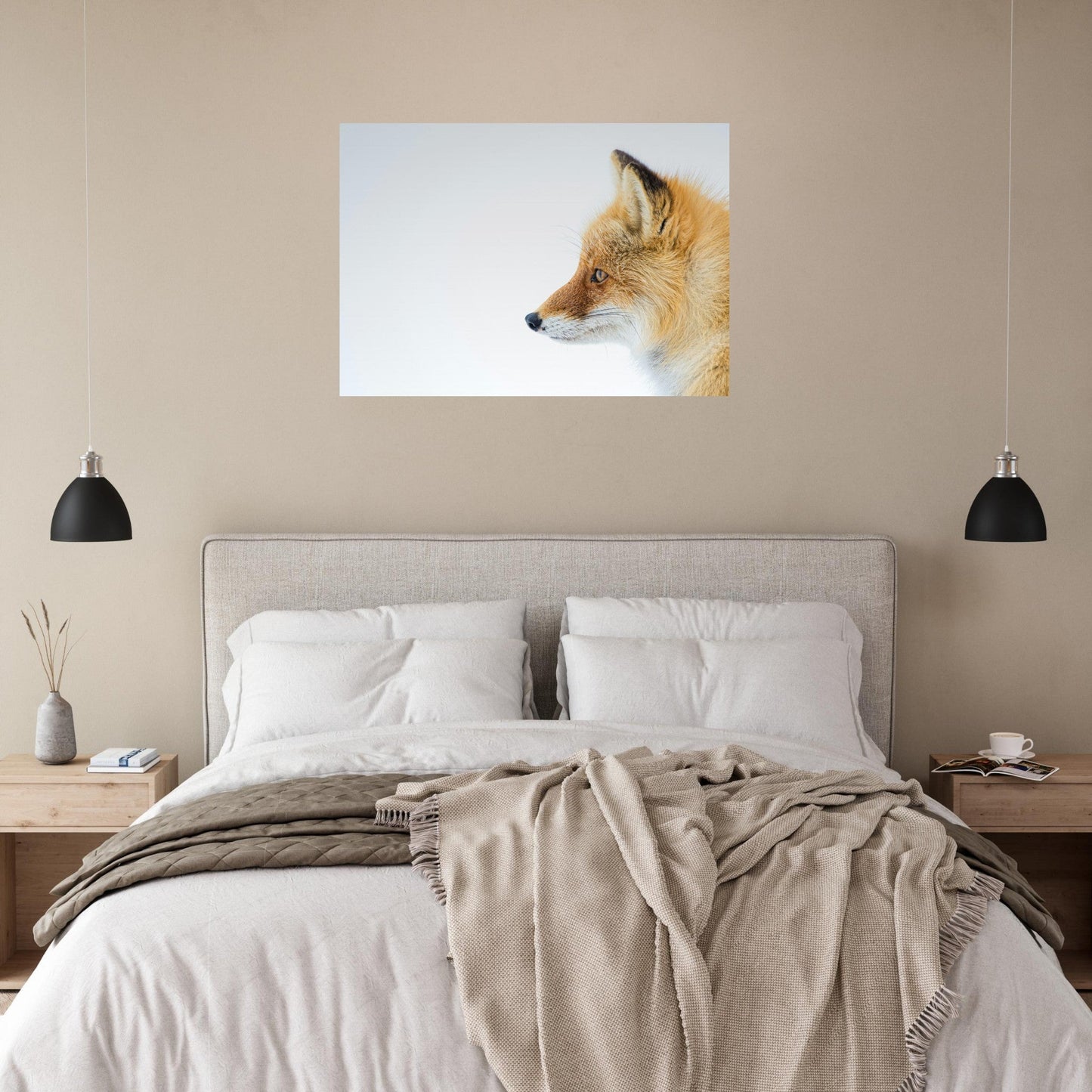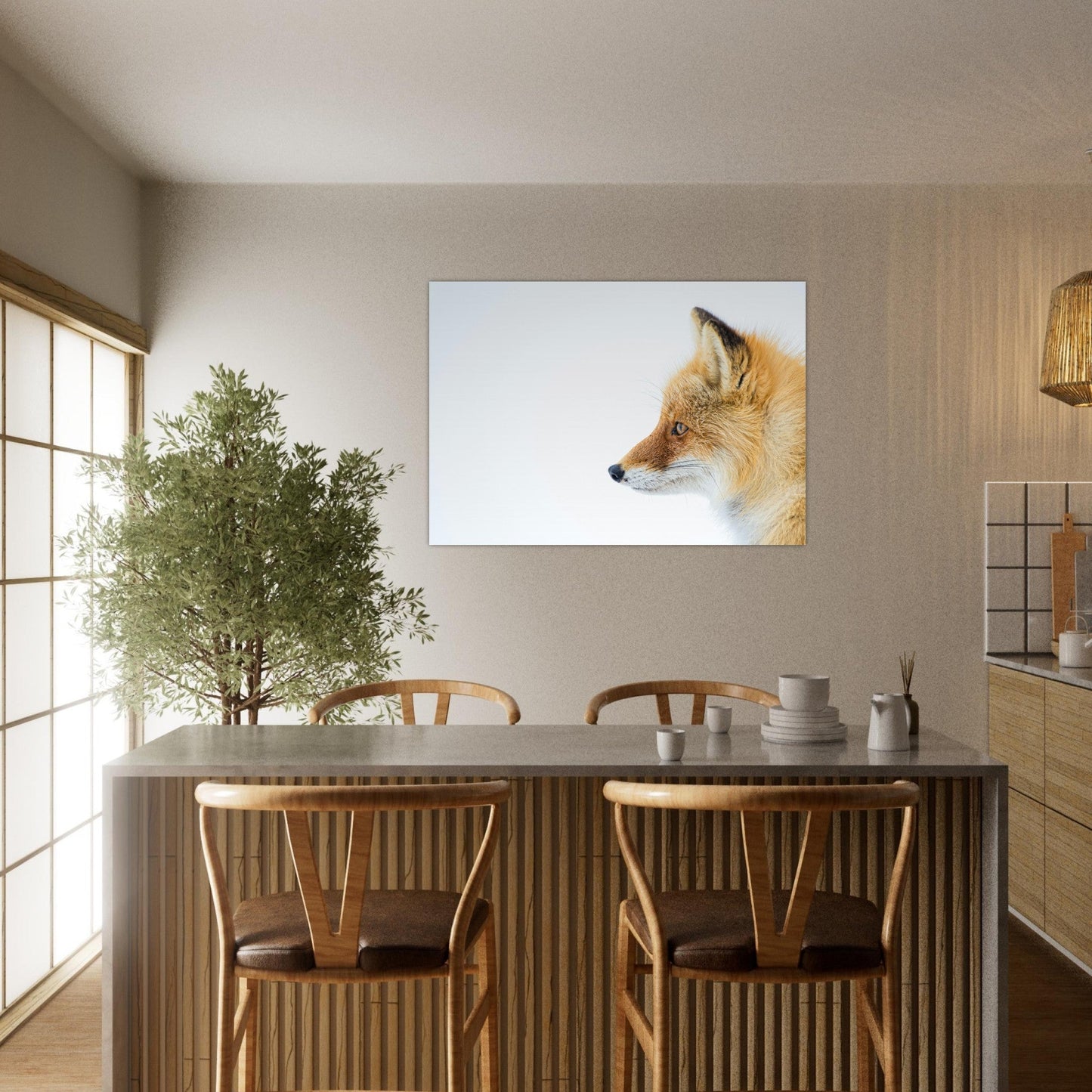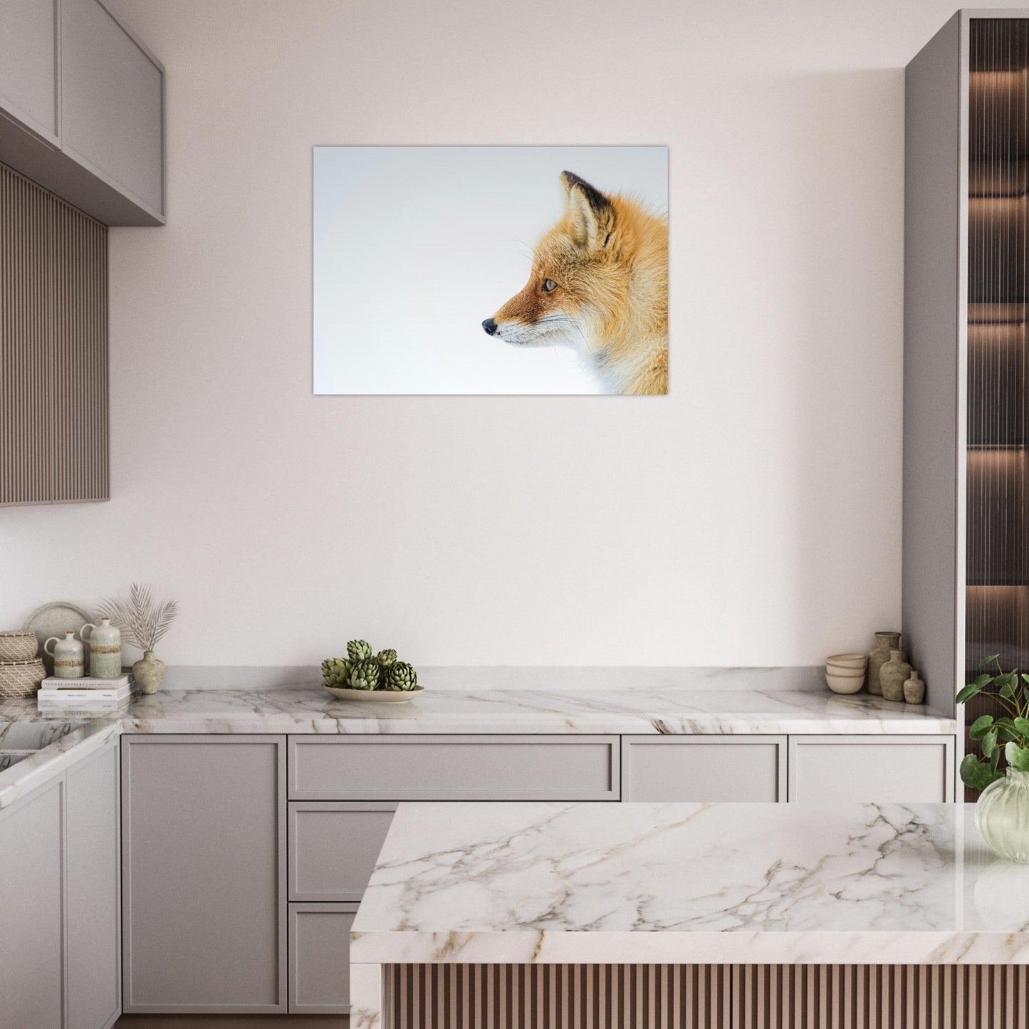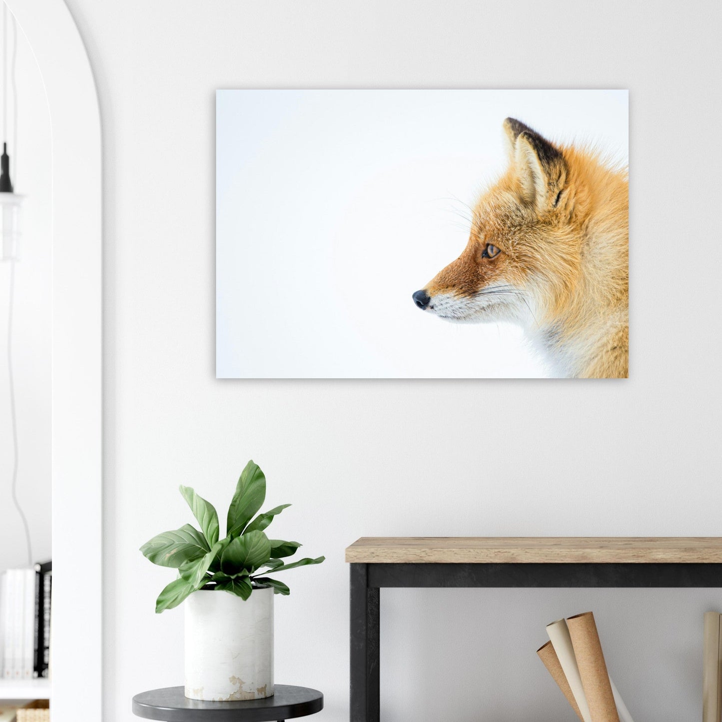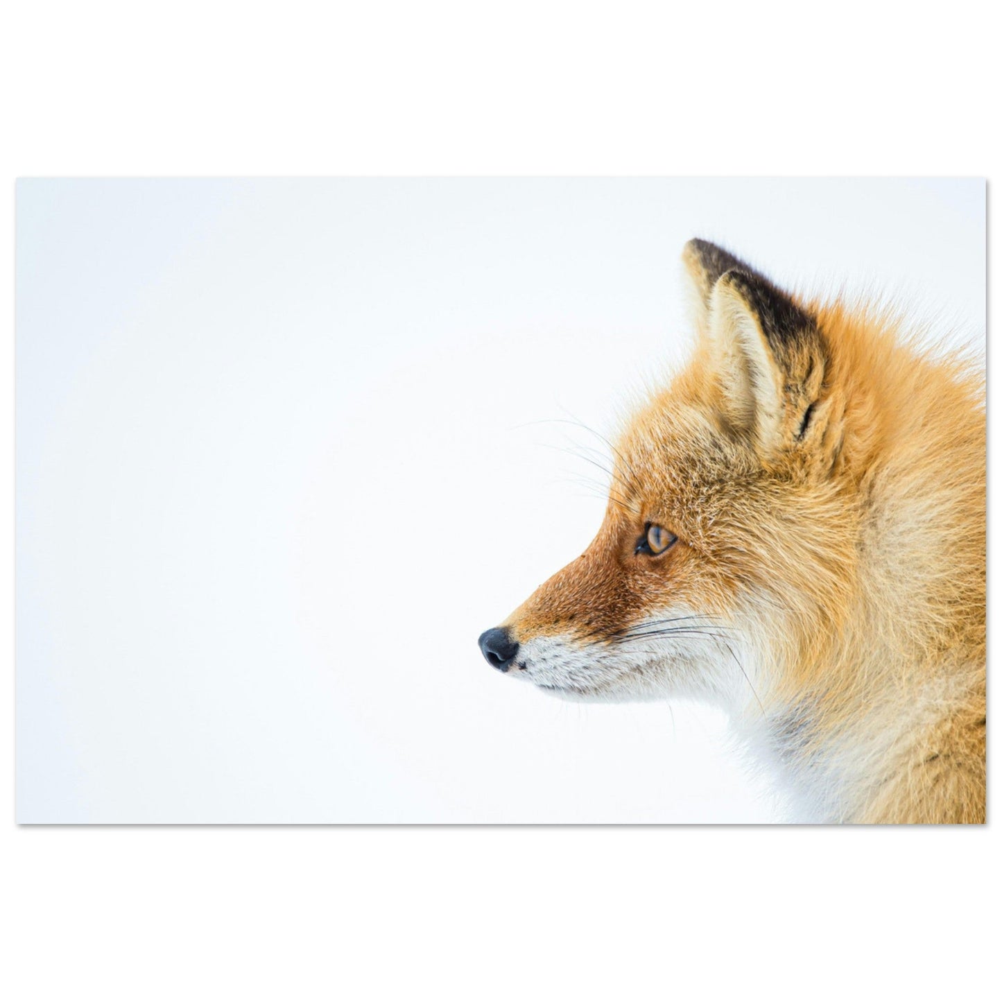 Clean profile of a red fox against a snowy background : black muzzle, amber eye and red fur cut into a minimalist and luminous frame. A sober, graphic and very decorative image.