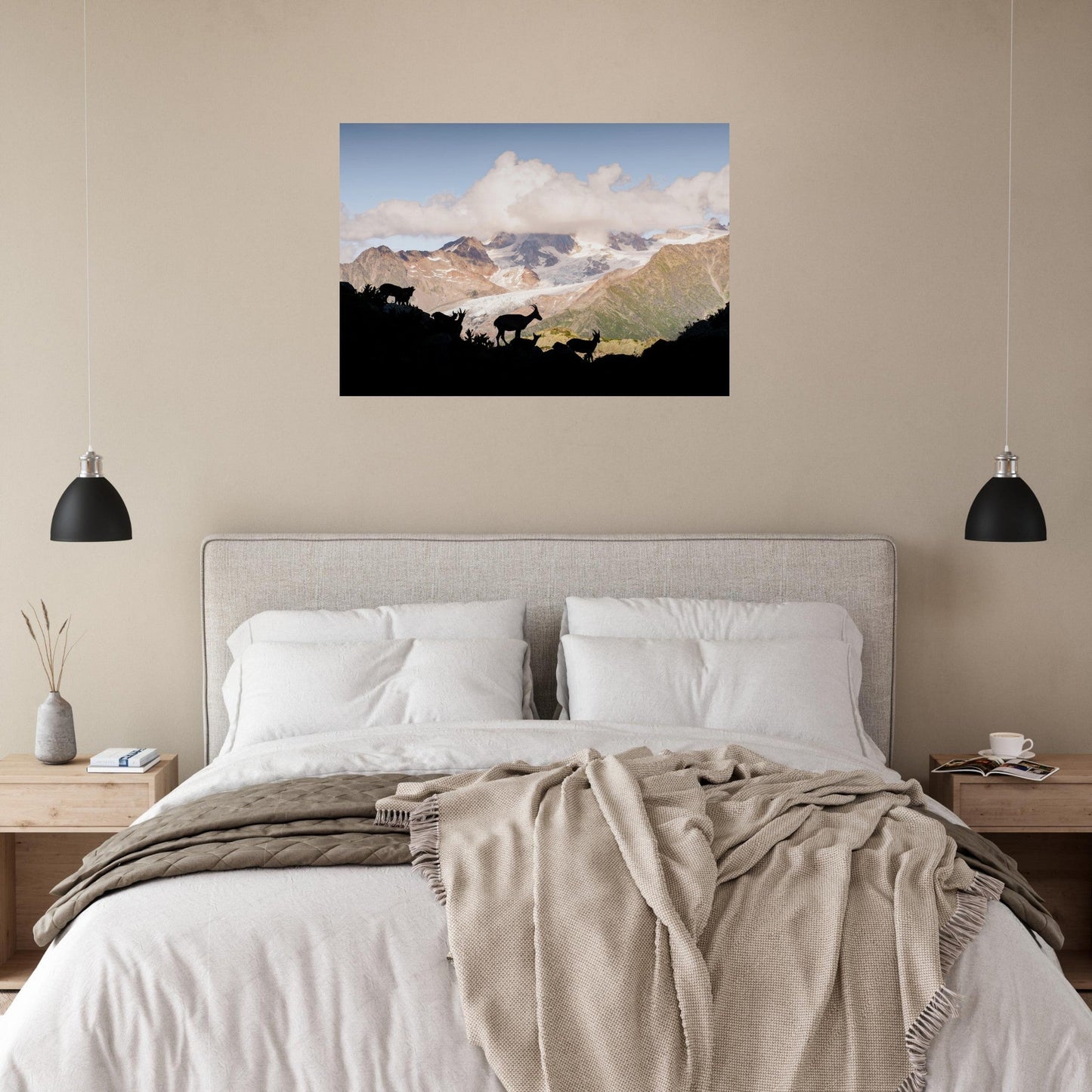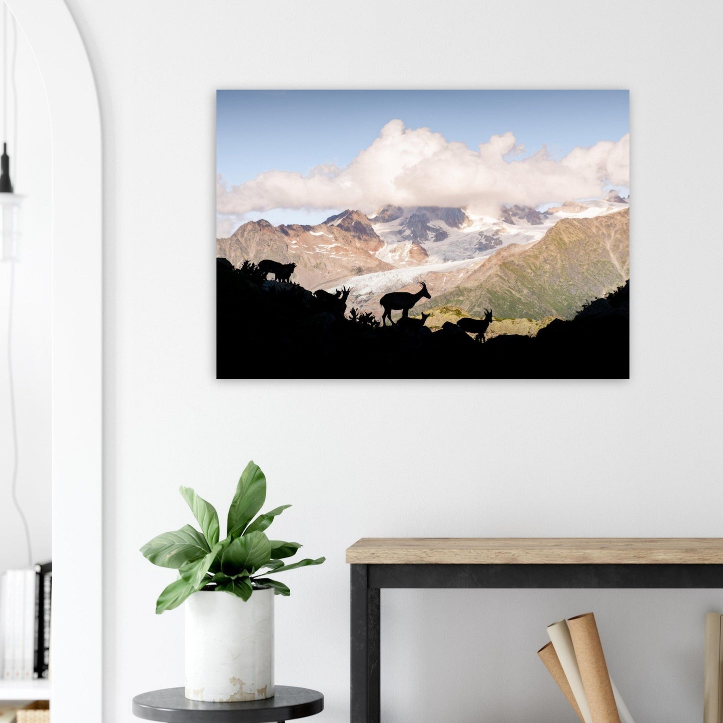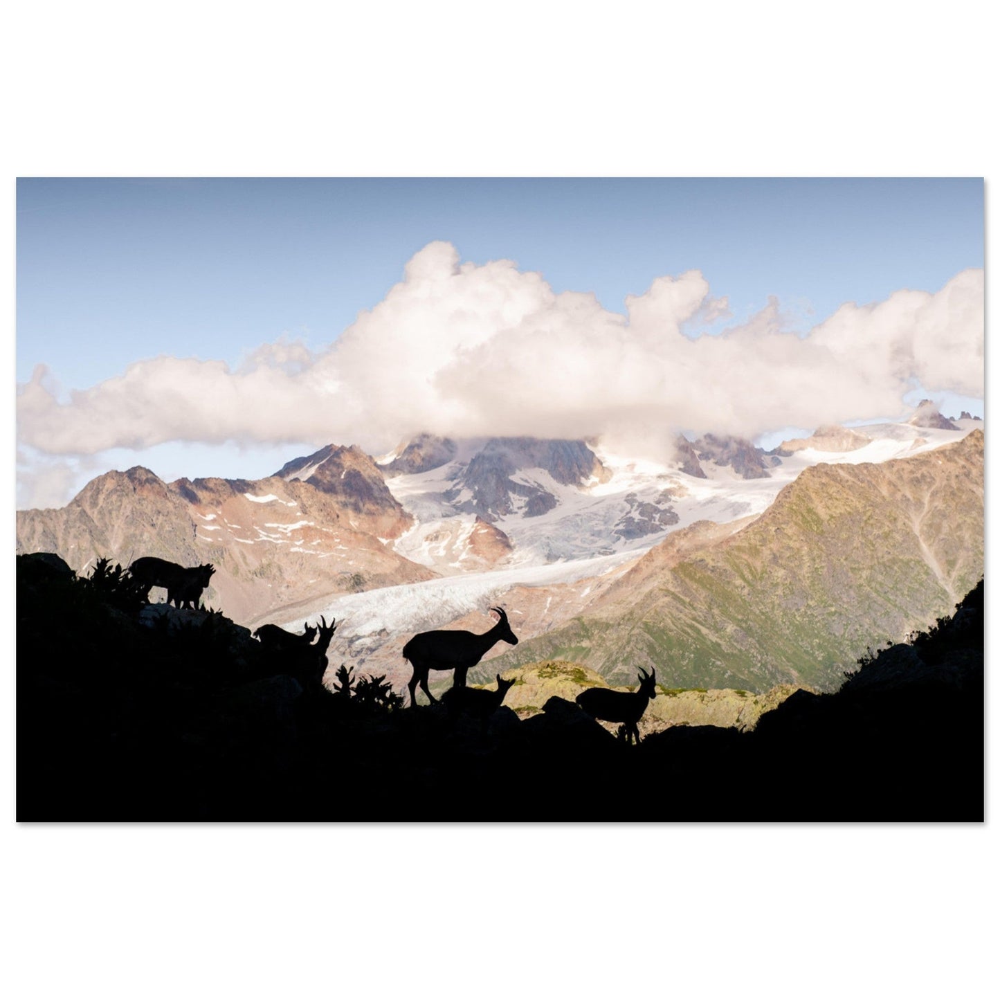 A rare and touching scene in the Aiguilles Rouges : a family of ibex (adults & kids) move on the rocky slabs, bathed in morning light . A moment of wild, graphic and soothing life for wall decoration .