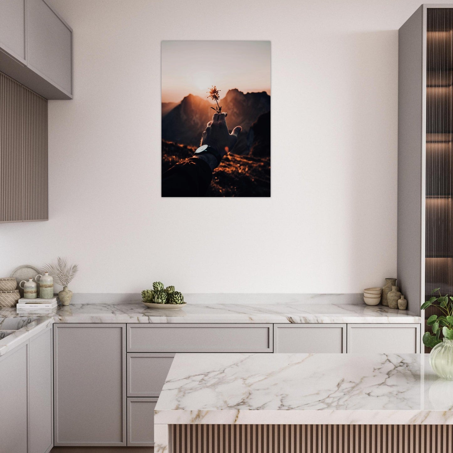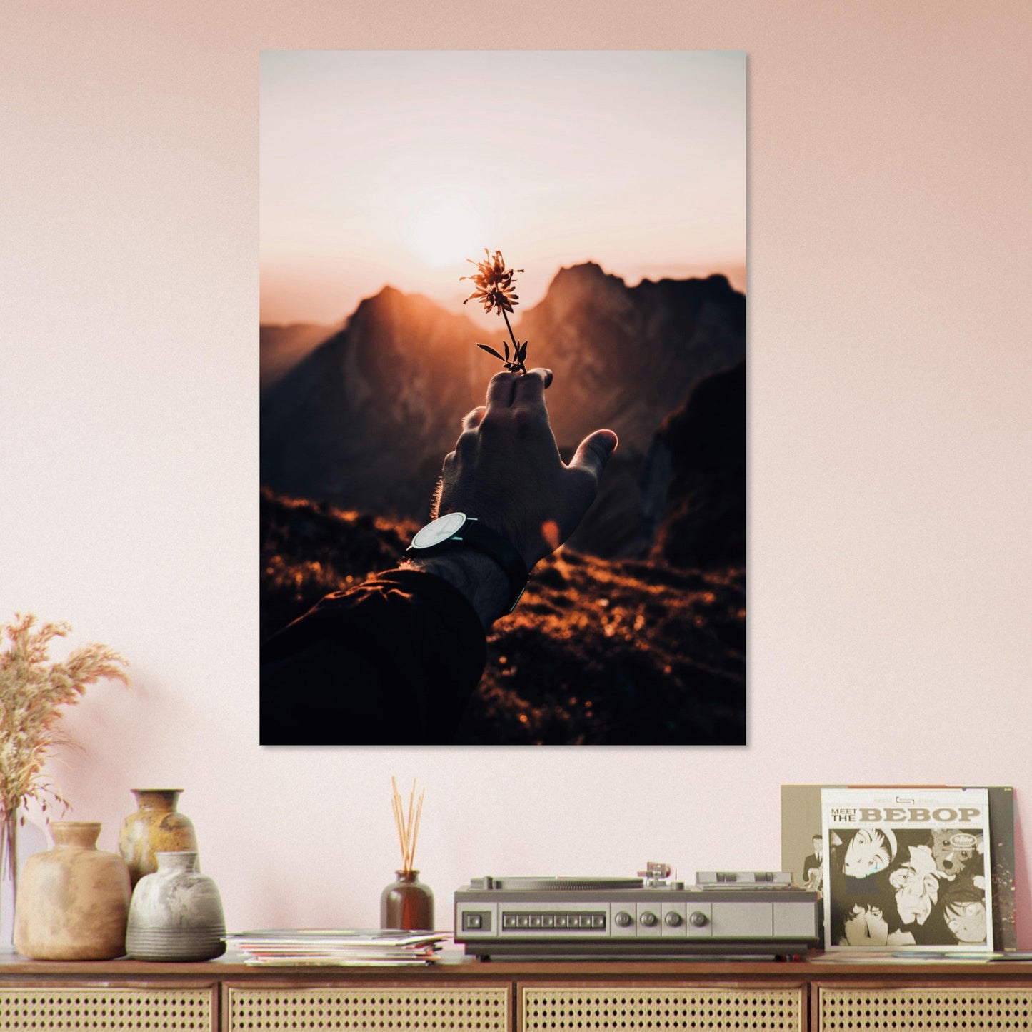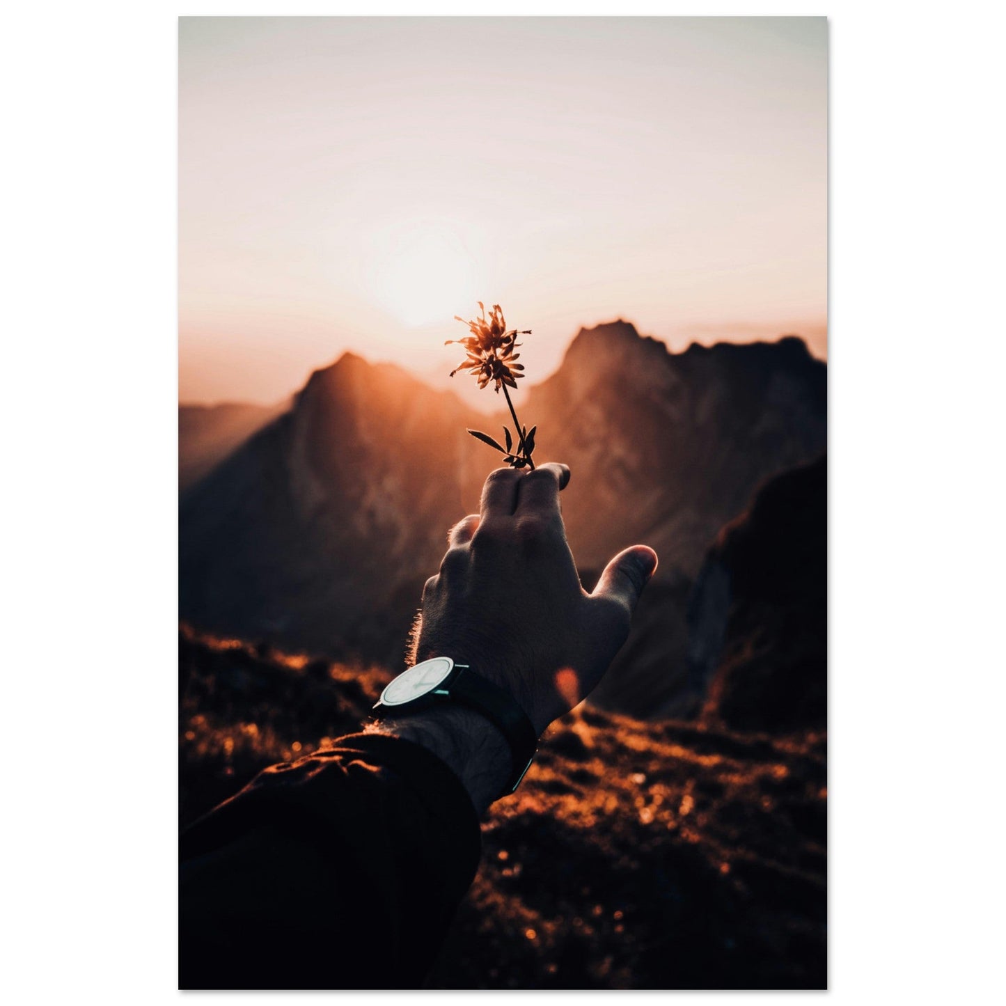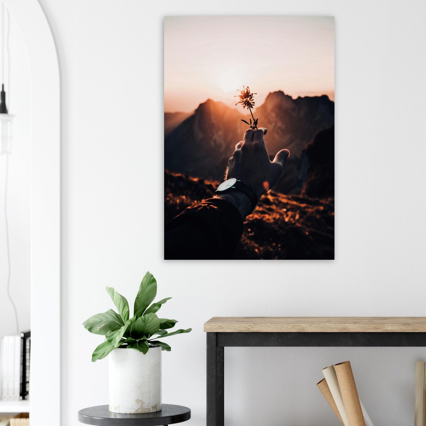 Visual reading: subject close and clear, silhouette of the hand backlit, mountains in soft layers — a poetic image that mixes alpine floral and large landscape , perfect for a natural & contemporary decor.