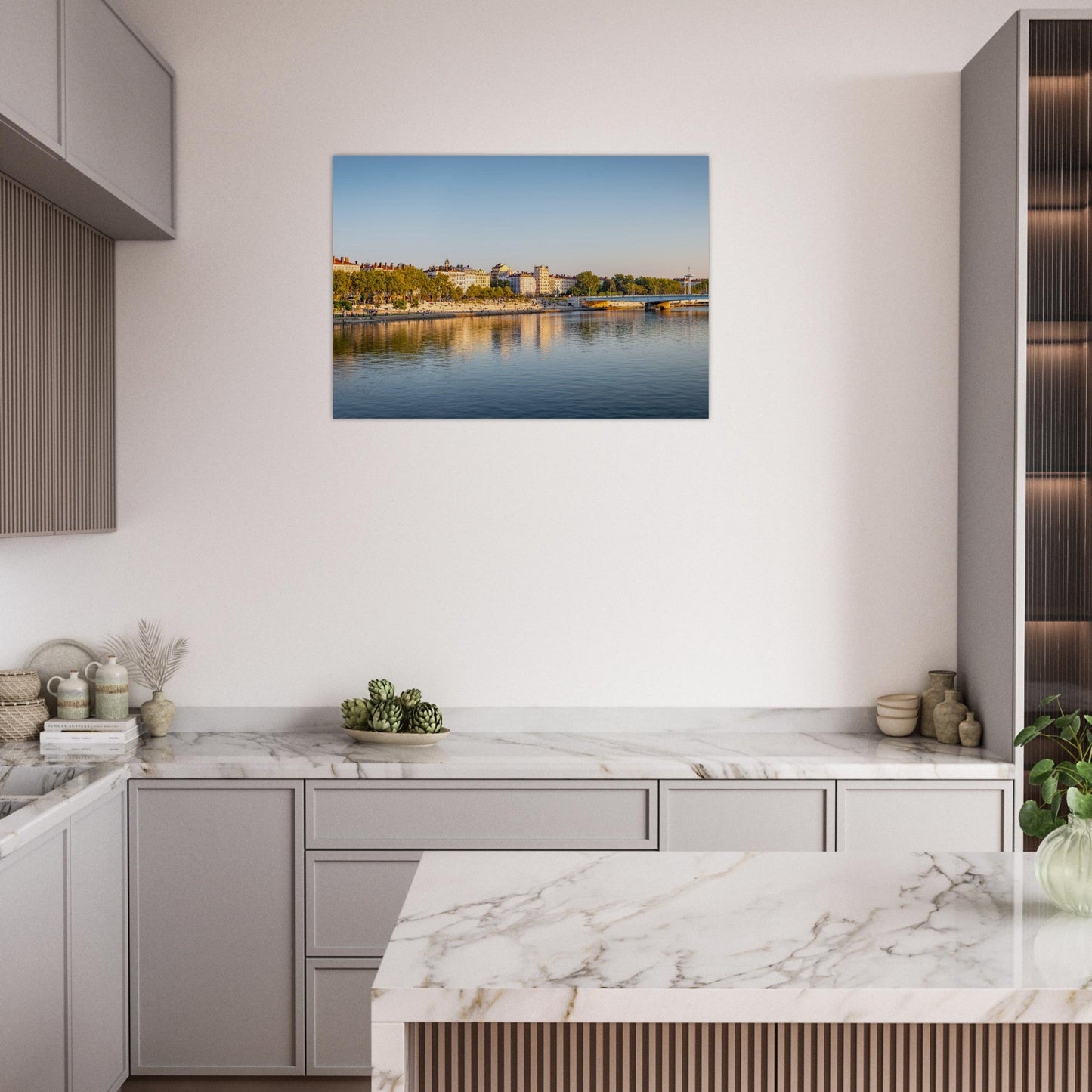 - Palette : bleus/verts du fleuve, gris pierre, lumières de ville — accords bois clair, blanc, noir mat, métal.