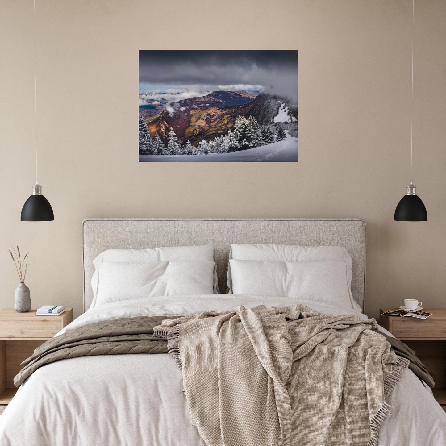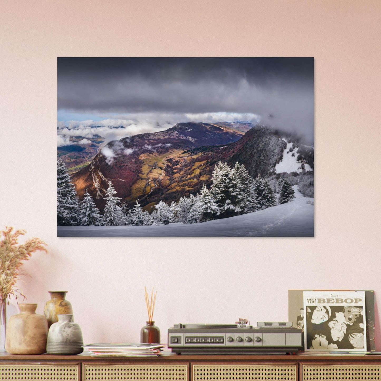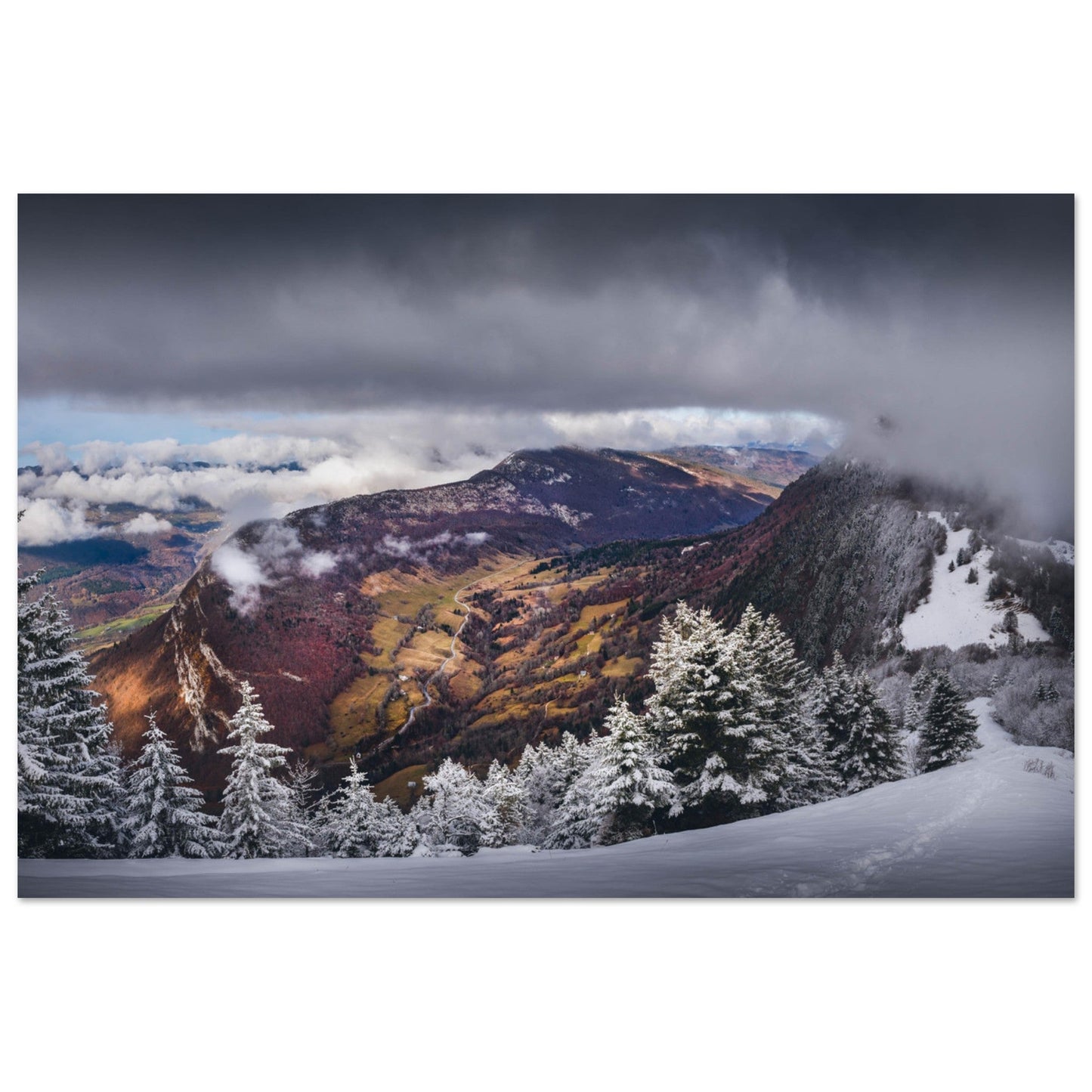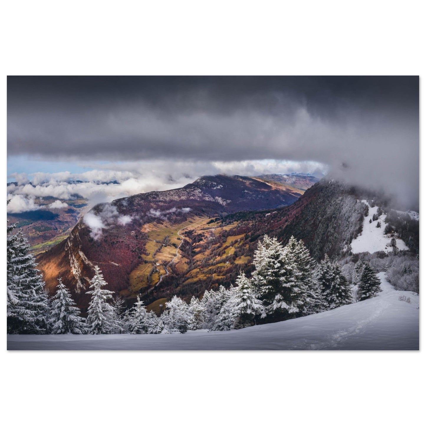 Entre Aillon-le-Jeune et Lescheraines, le col des Prés s’offre en version hivernale : versants poudrés, bosquets de sapins et courbes douces typiques du Massif des Bauges. Une atmosphère graphique et apaisante qui fonctionne parfaitement en décoration murale.