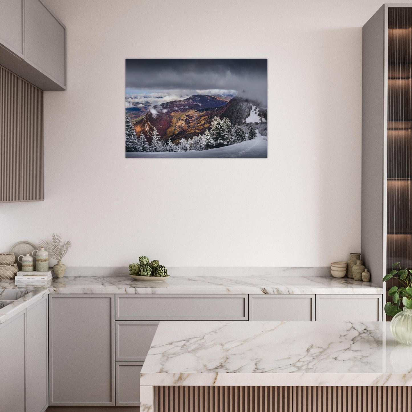 L’Alu Dibond offre une planéité parfaite, un rendu mat sans reflet et une grande longévité, sans vitrage — idéal pour sublimer les détails en montagne. Le tableau est prêt à être accroché.