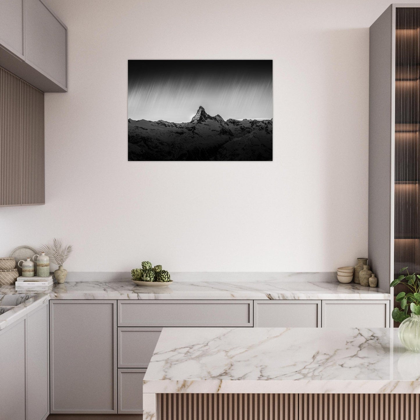Décoration d’un appartement à Zermatt autour du Cervin en noir & blanc. Sélection d’images, simulation, production et livraison de tableaux Alu Dibond mat pour un rendu chic et intemporel.