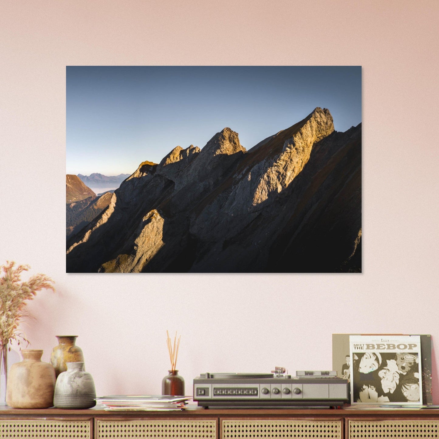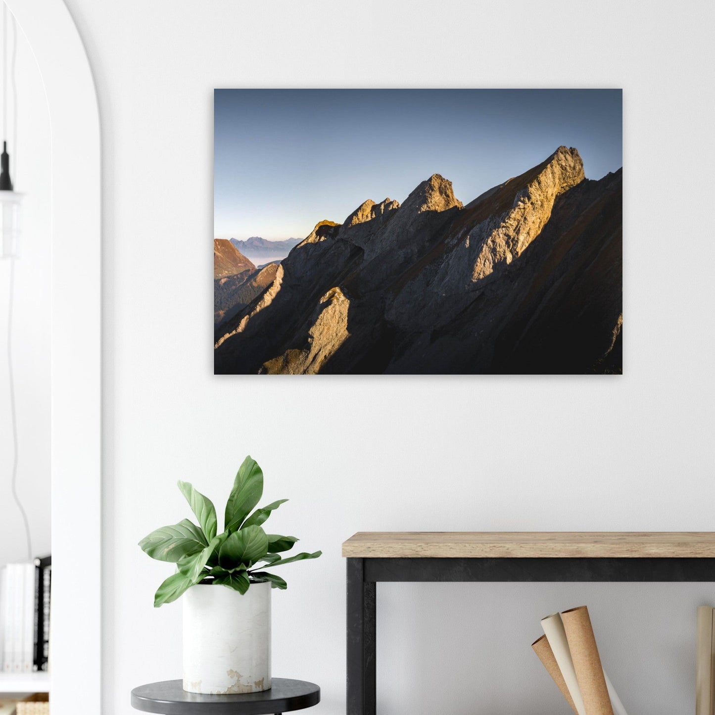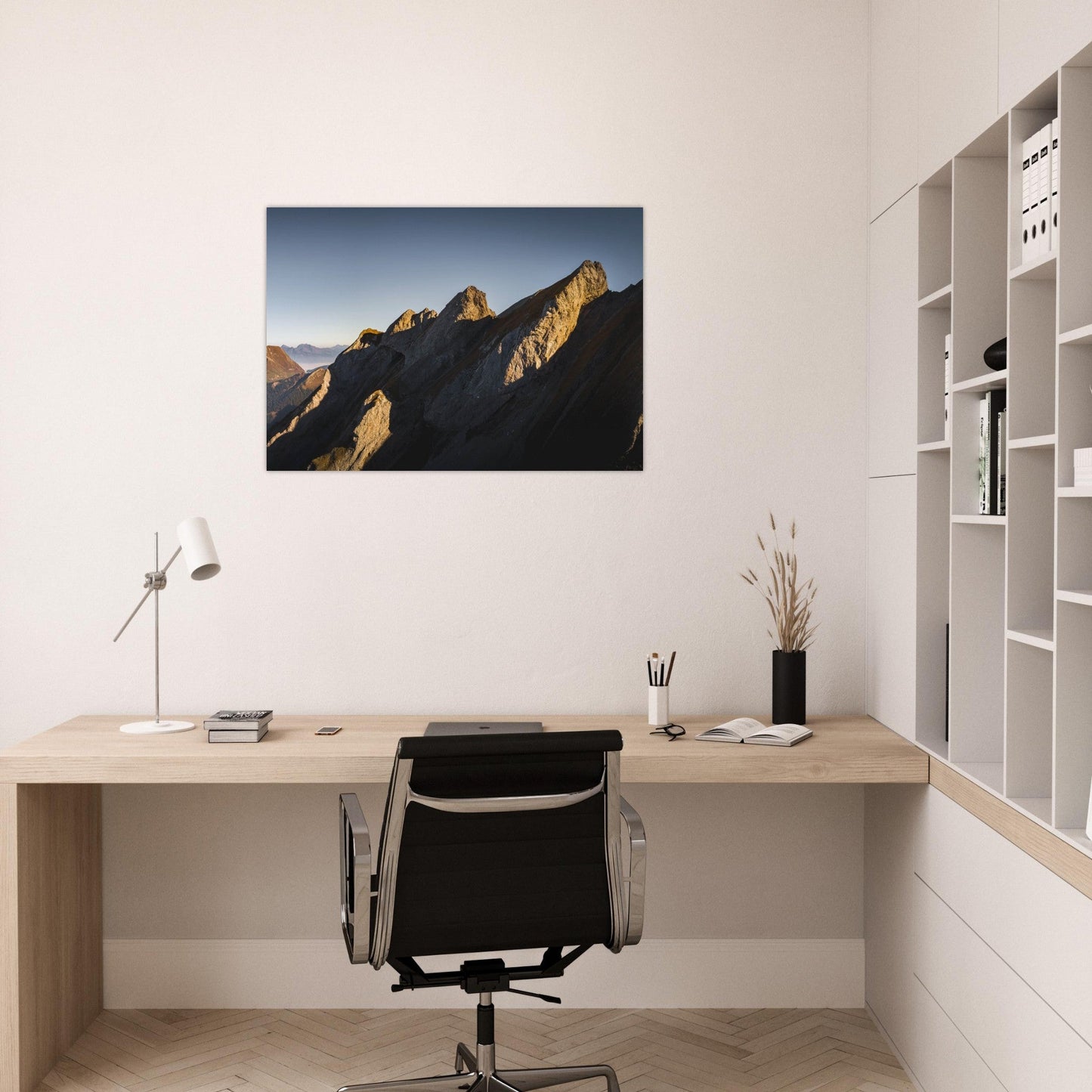 L’Alu Dibond offre une planéité parfaite, un rendu mat sans reflet et une grande longévité, sans vitrage — idéal pour sublimer les détails en montagne. Le tableau est prêt à être accroché.