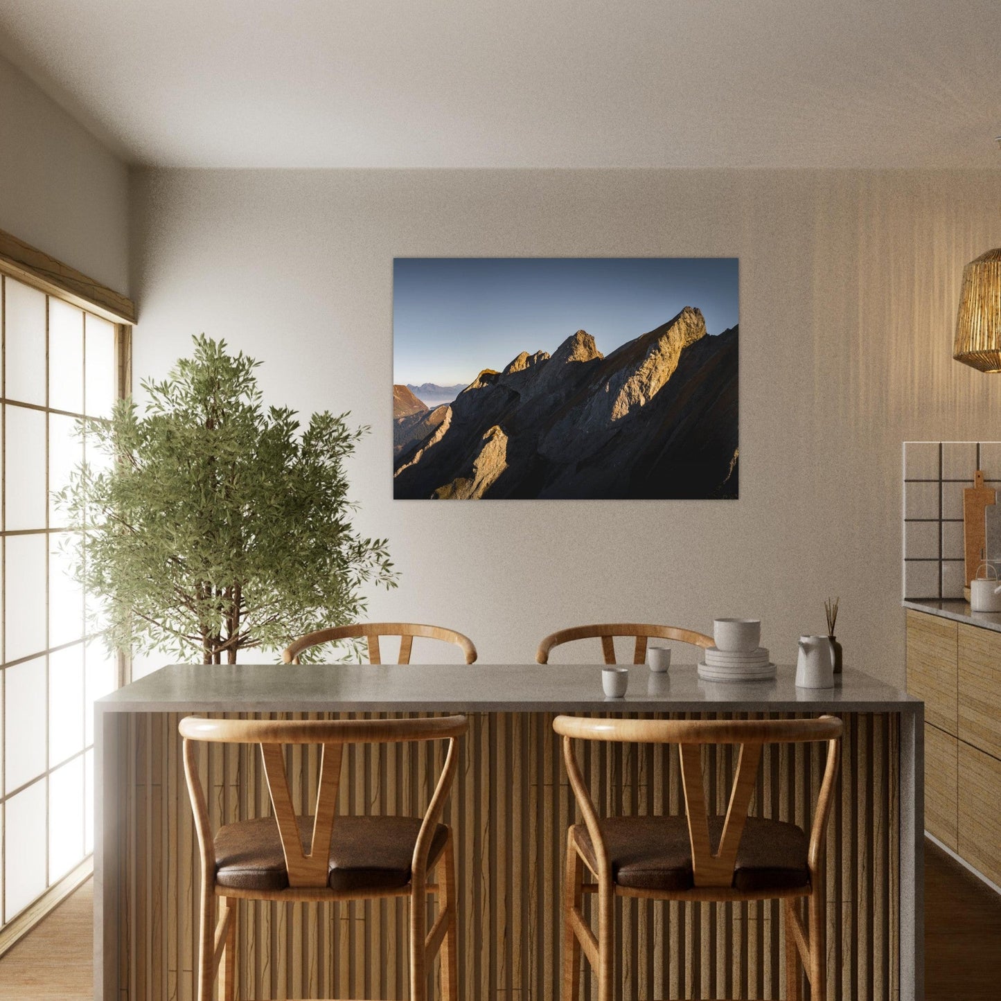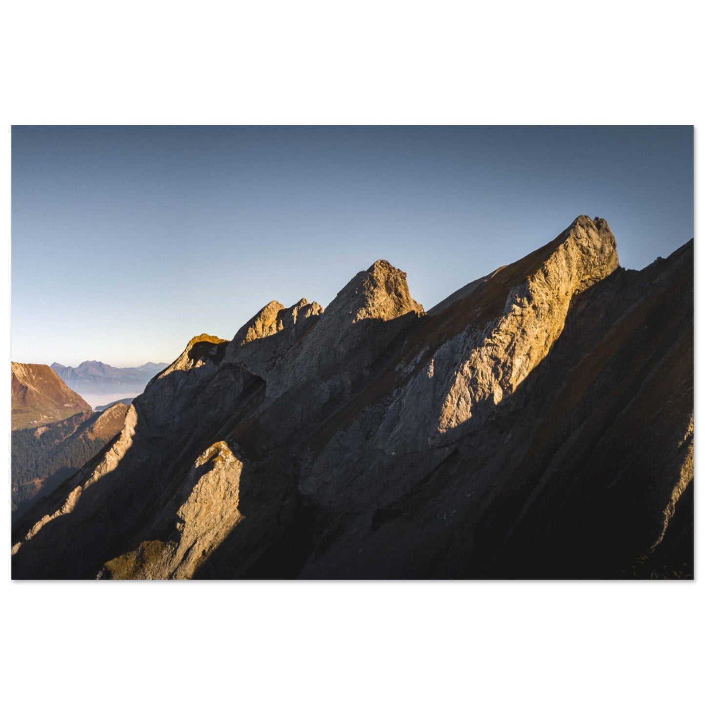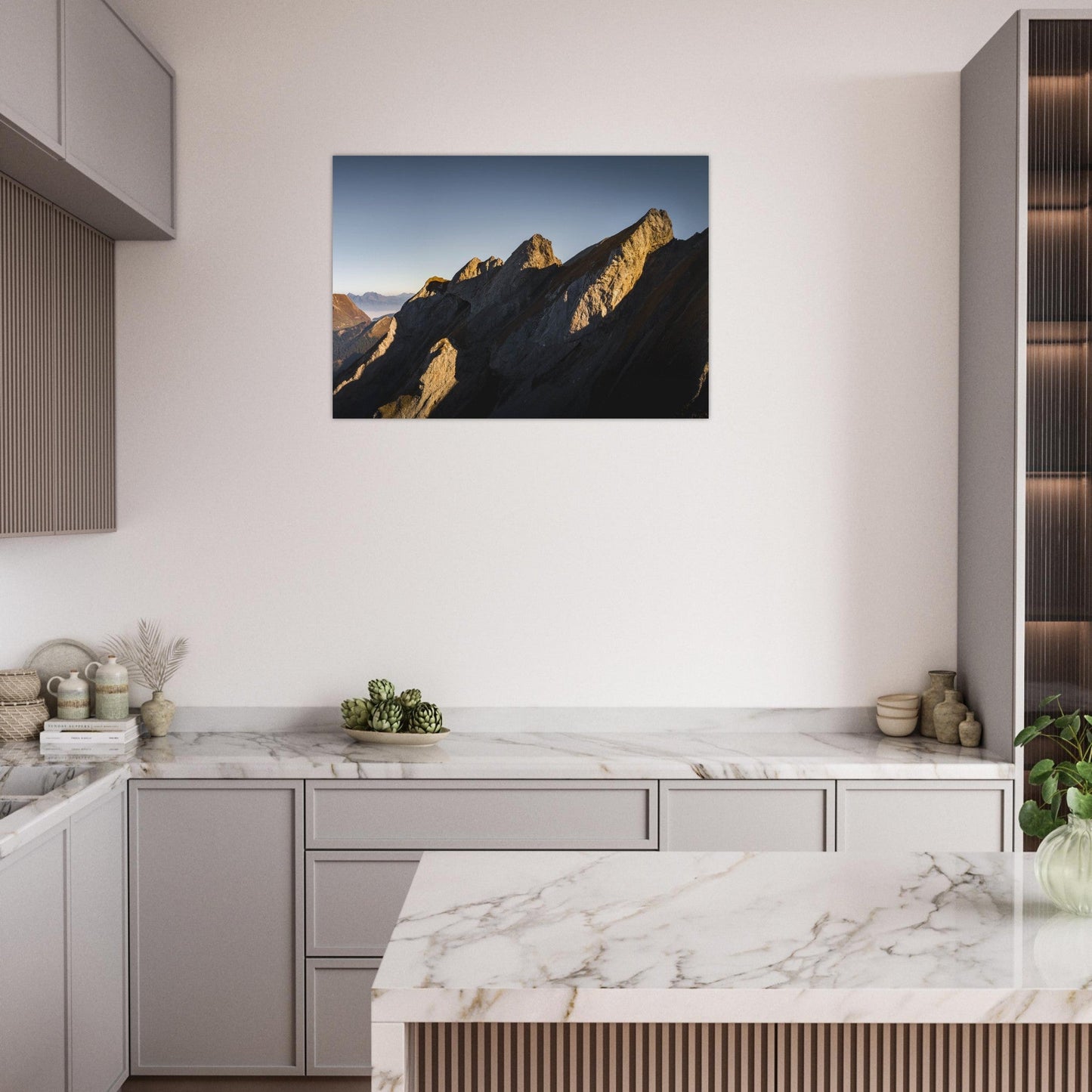 L’Alu Dibond offre une planéité parfaite, un rendu mat sans reflet et une grande longévité, sans vitrage — idéal pour sublimer les détails en montagne. Le tableau est prêt à être accroché.