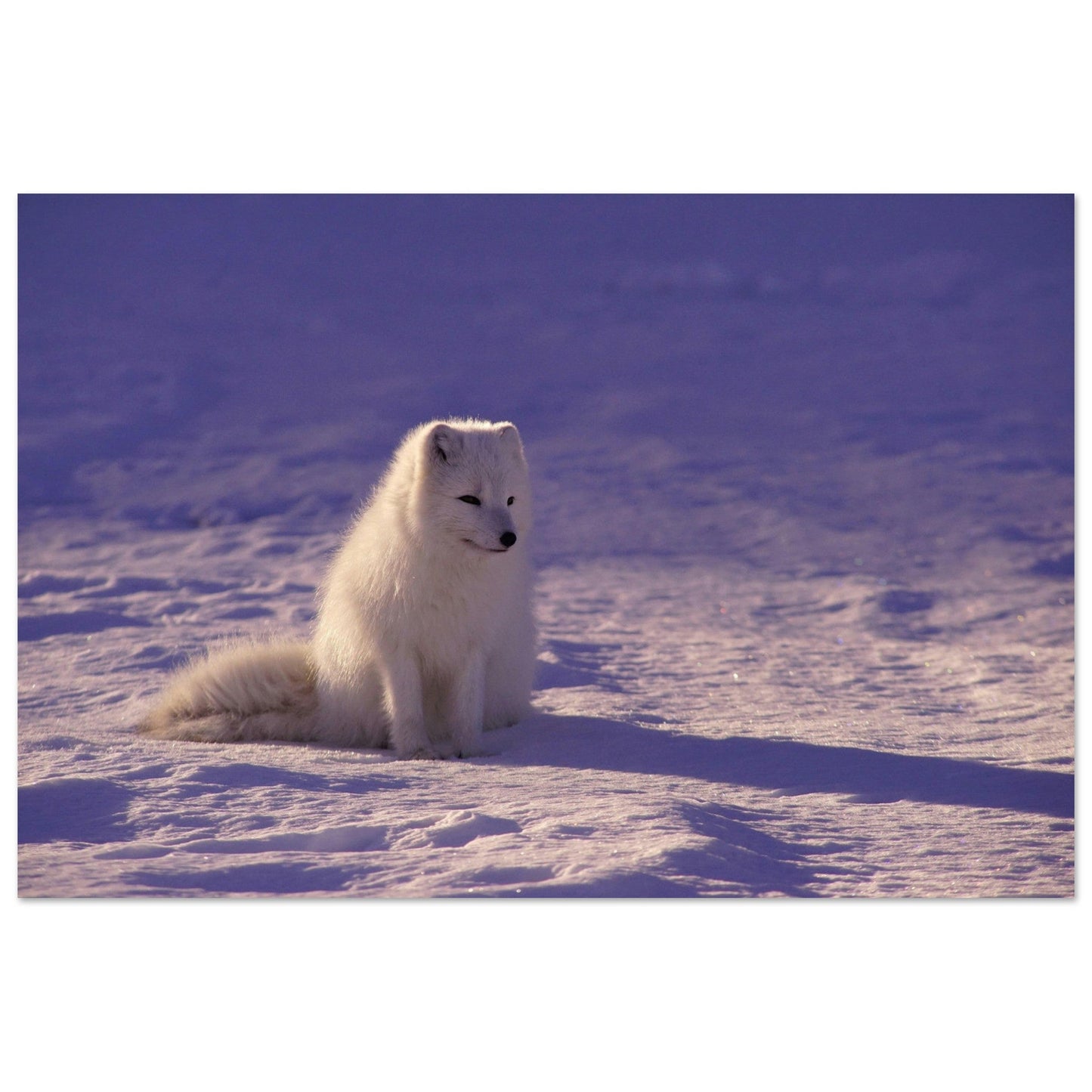 Portrait d’un renard polaire (Vulpes lagopus) en livrée blanche : pelage duveteux, queue épaisse et ombres mauves sur la neige. Une scène nordique minimaliste et apaisante.
